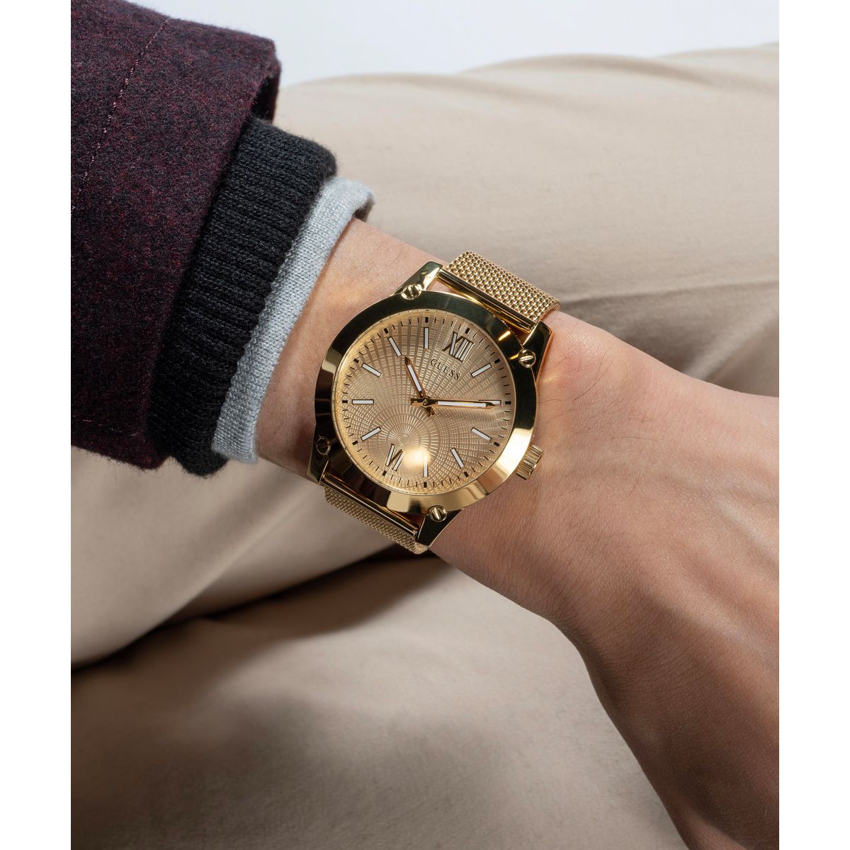 El GUESS GW0629G2 es un reloj analógico para hombre en tono dorado con una caja de acero inoxidable de 44 mm y un brazalete a juego. Cuenta con una esfera dorada, un acabado pulido y un cierre de hebilla de gancho. El reloj es resistente al agua hasta 30 metros y funciona con movimiento de cuarzo.