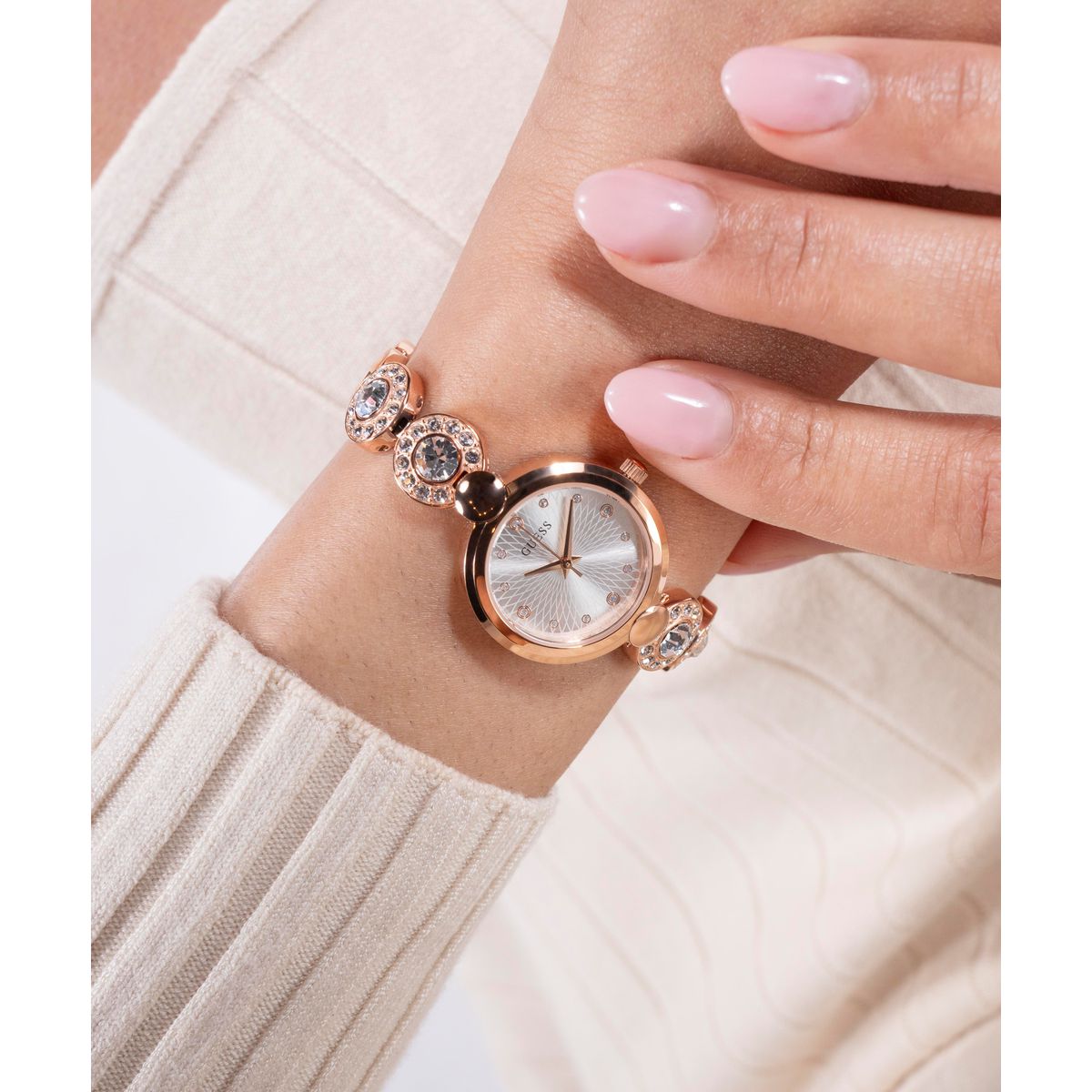 El reloj analógico en tono de oro rosa para mujer GUESS (GW0757L3) es un impresionante reloj con una caja de 26 mm en tono oro rosa y dos eslabones de cristal a cada lado. Cuenta con una esfera plateada texturizada, eslabones G autoajustables y está fabricado con acero reciclado. Además, es resistente al agua hasta 30 metros