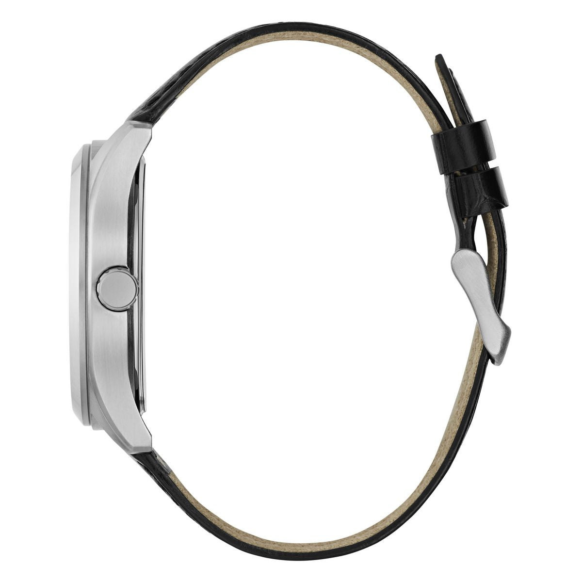 El GUESS GW0809G1 es un reloj multifunción para hombre en tono plateado que se presenta en una caja con correas intercambiables. Cuenta con una caja de acero inoxidable de 42 mm, una esfera negra y un acabado pulido. El conjunto incluye una correa de cuero genuino y una correa de silicona lisa, lo que permite un estilo versátil. El reloj es resistente al agua hasta 50 metros y funciona con movimiento de cuarzo.