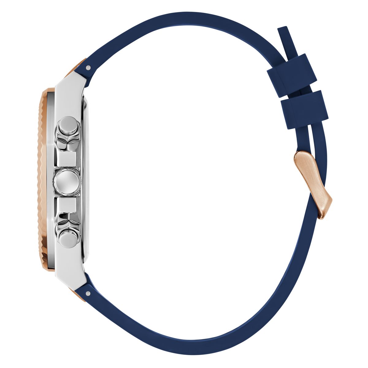 El Guess GW0791G2 es un reloj multifunción azul bicolor para hombre con una caja de acero inoxidable reciclado de 44 mm. Cuenta con un bisel con borde de moneda, una esfera multifunción de aspecto cronológico y una correa FLEX que combina cuero liso negro con una cómoda base de silicona. Este reloj es resistente al agua hasta 50 metros, lo que lo hace adecuado para el uso diario.