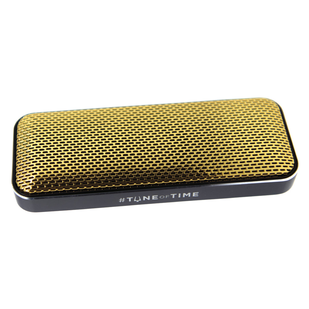 A pesar de su tamaño compacto, este parlante ofrece una calidad de sonido sorprendente, con bajos profundos y agudos claros. La tecnología de sonido de alta precisión (HPA) garantiza una experiencia auditiva inmersiva. Su carcasa está recubierta por una malla metálica de color dorado, lo que le otorga un aspecto lujoso y moderno. Los bordes negros crean un contraste visual atractivo.