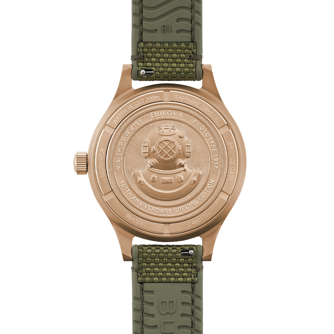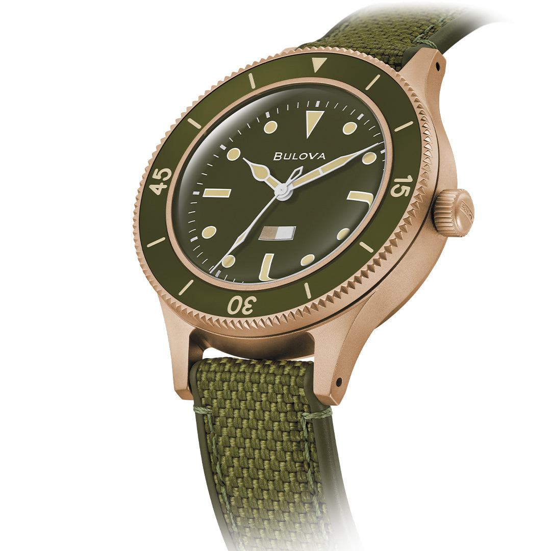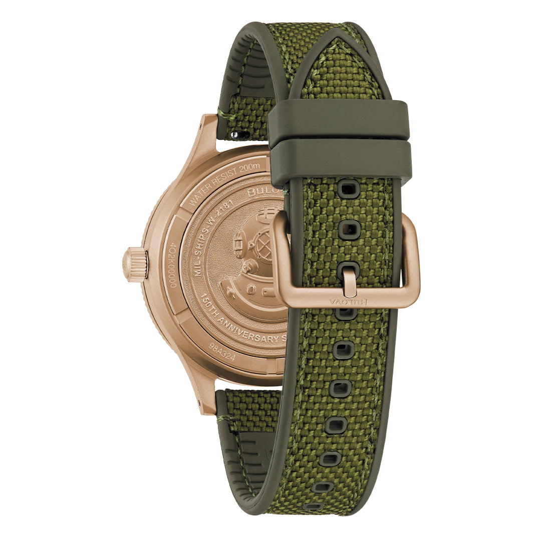 Honrando la legendaria trayectoria de Bulova con las fuerzas armadas y basándose en un prototipo excepcional de 1957 desarrollado para la Marina de los EE. UU., la Edición Especial MIL-SHIPS Bronze celebra el 150.º aniversario de Bulova y su legado de innovación y artesanía fina. Este reloj, recientemente reinventado, presenta un diseño sofisticado con una caja con acabado arenado hecha de bronce CuSn8, un material brillante con un tono oro rosa que recuerda a los cascos de buceo de cobre del siglo XIX. El bronce es mucho más resistente que el cobre y, con el tiempo, forma una pátina natural, añadiendo una capa protectora que aumenta su durabilidad y enriquece su aspecto único y atemporal. Entre sus características distintivas se incluyen una esfera verde militar con un bisel bidireccional de aluminio a juego, un manecillas de inspiración vintage con manecillas y marcadores superluminosos, una tira indicadora de humedad bicolor y un cristal de zafiro de doble cúpula con un revestimiento antirreflectante de 5 capas. Equipado con una correa verde militar mejorada de 18 mm, hecha de una combinación de caucho y nailon Cordura® para mayor durabilidad y comodidad, y accionado por un movimiento automático de 21 rubíes con una reserva de marcha de 42 horas, luce un fondo de caja en relieve conmemorativo del 150.º aniversario y es resistente al agua hasta 200 metros. Presentado en un embalaje de primera calidad con un libro de cuentos, este reloj MIL-SHIPS Bronce para hombre, inspirado en la historia, es un imprescindible tanto para coleccionistas como para aficionados.
