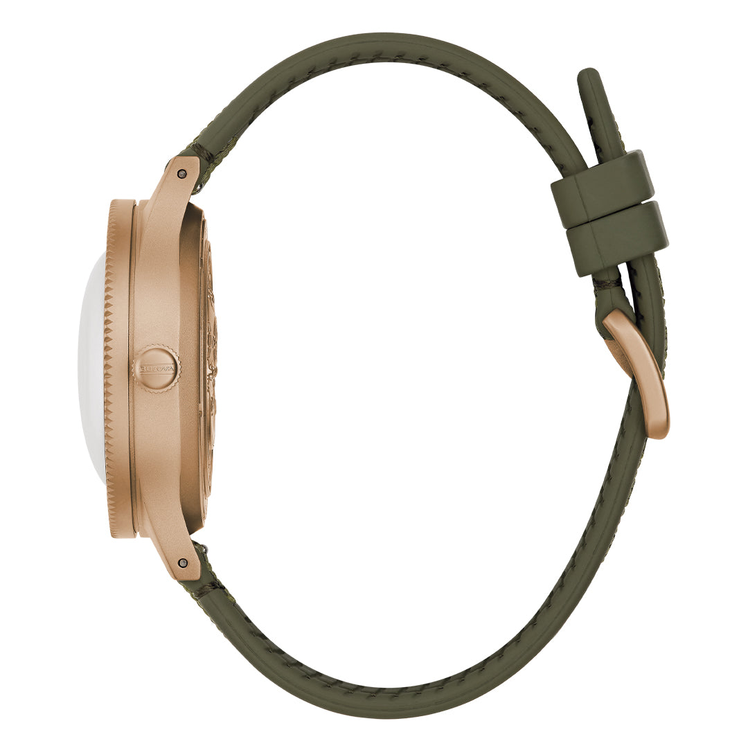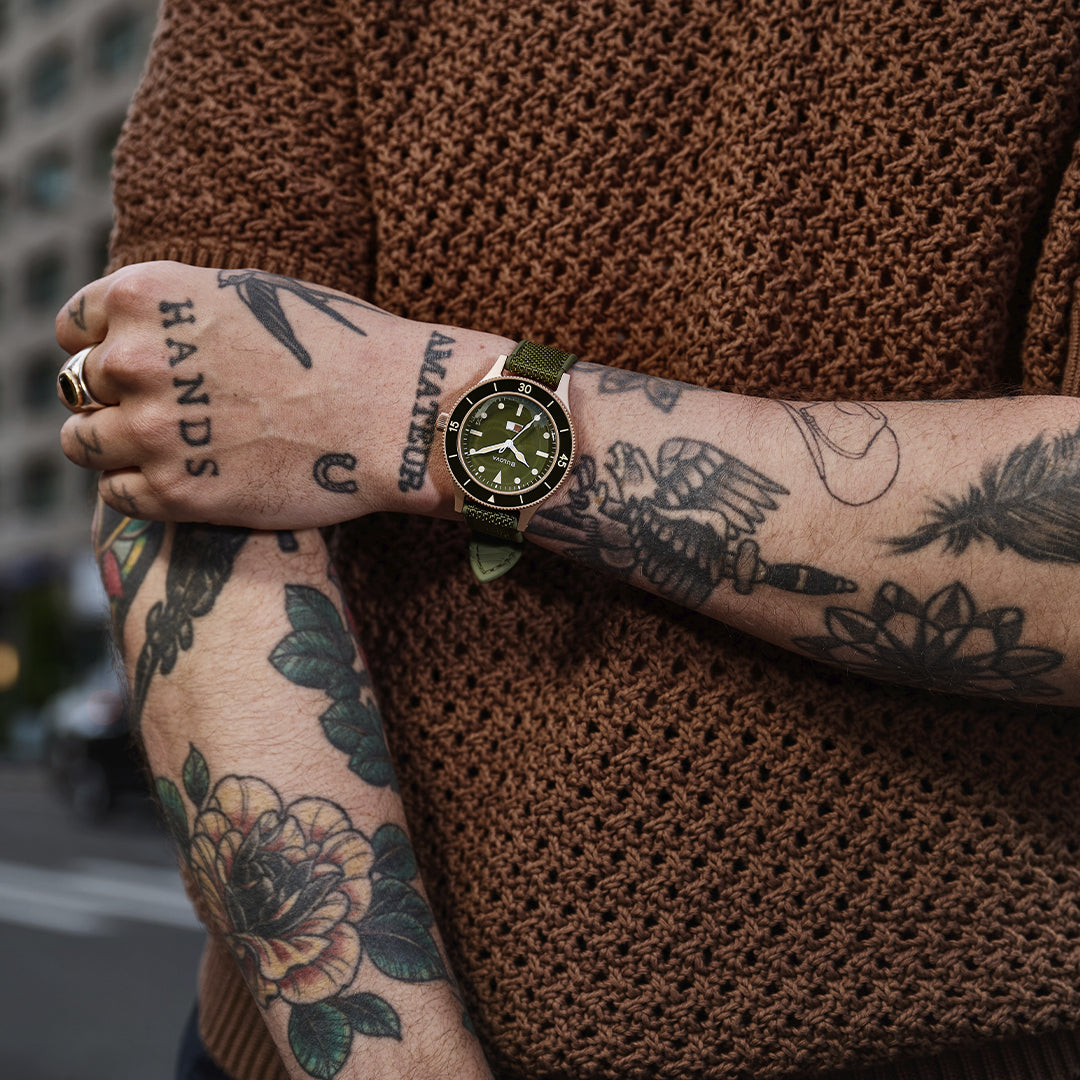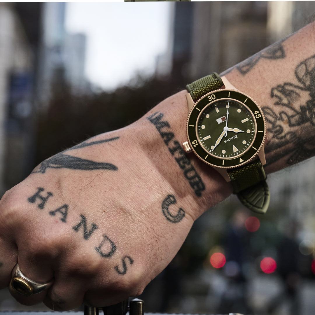 Honrando la legendaria trayectoria de Bulova con las fuerzas armadas y basándose en un prototipo excepcional de 1957 desarrollado para la Marina de los EE. UU., la Edición Especial MIL-SHIPS Bronze celebra el 150.º aniversario de Bulova y su legado de innovación y artesanía fina. Este reloj, recientemente reinventado, presenta un diseño sofisticado con una caja con acabado arenado hecha de bronce CuSn8, un material brillante con un tono oro rosa que recuerda a los cascos de buceo de cobre del siglo XIX. El bronce es mucho más resistente que el cobre y, con el tiempo, forma una pátina natural, añadiendo una capa protectora que aumenta su durabilidad y enriquece su aspecto único y atemporal. Entre sus características distintivas se incluyen una esfera verde militar con un bisel bidireccional de aluminio a juego, un manecillas de inspiración vintage con manecillas y marcadores superluminosos, una tira indicadora de humedad bicolor y un cristal de zafiro de doble cúpula con un revestimiento antirreflectante de 5 capas. Equipado con una correa verde militar mejorada de 18 mm, hecha de una combinación de caucho y nailon Cordura® para mayor durabilidad y comodidad, y accionado por un movimiento automático de 21 rubíes con una reserva de marcha de 42 horas, luce un fondo de caja en relieve conmemorativo del 150.º aniversario y es resistente al agua hasta 200 metros. Presentado en un embalaje de primera calidad con un libro de cuentos, este reloj MIL-SHIPS Bronce para hombre, inspirado en la historia, es un imprescindible tanto para coleccionistas como para aficionados.