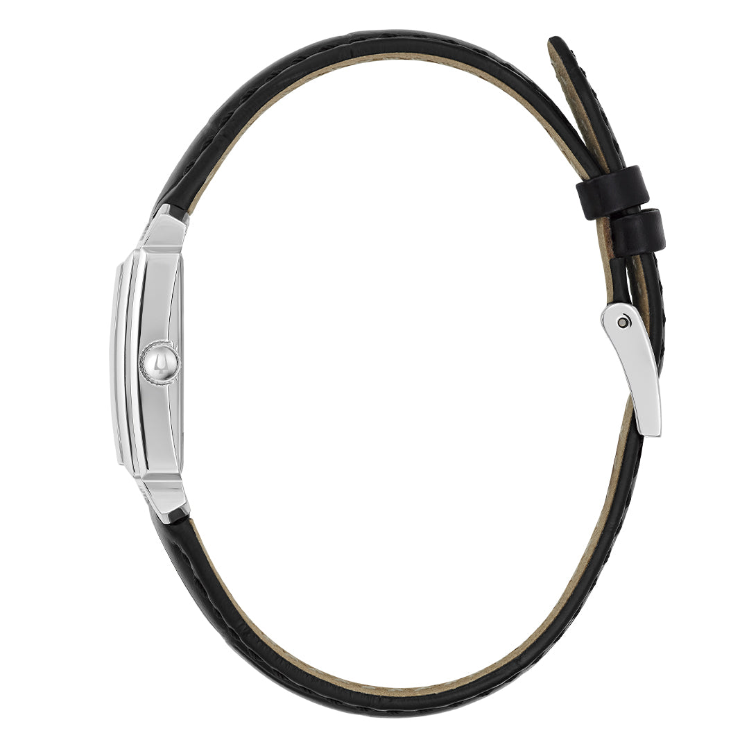 Este pequeño reloj de mujer de Bulova añade un nuevo estilo a la ya impresionante colección Sutton. La refinada caja rectangular de acero inoxidable en tono plateado cuenta con un cristal mineral y un acabado que brilla intensamente a la luz. La brillante esfera de nácar está acentuada con marcadores de números romanos en tono plateado y manecillas a juego para una apariencia de verdadera elegancia. El reloj está emparejado con una elegante correa de cuero negro con pasadores con cierre de seguridad para una fácil liberación y una hebilla de tres piezas que combina con la caja. Un versátil reloj de mujer de Bulova con el estilo perfecto para una mujer que busca agregar un toque final elegante a su conjunto.