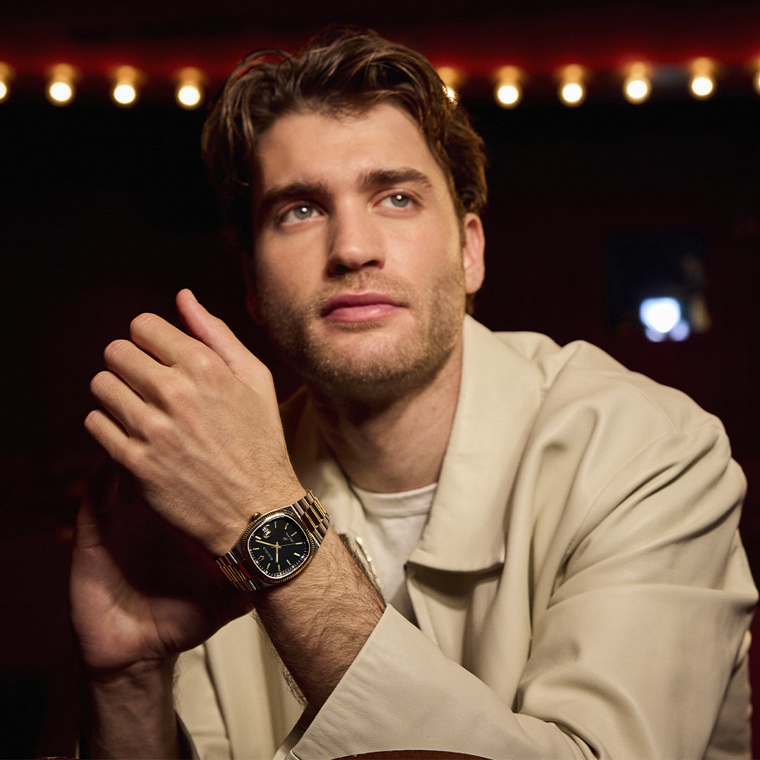 Con versatilidad para cada estilo, la caja de acero inoxidable de 38 mm en tonos dorados y plateados luce una silueta audaz con una silueta fluida creada por la transición de la caja en forma de televisor a la pulsera integrada de acero inoxidable bitono de 3 eslabones, que cuenta con un cierre desplegable con pulsador. Un elegante bisel ranurado con borde de moneda realza la caja y rodea un cristal de zafiro plano y su lupa de fecha. La atractiva esfera es de un negro cepillado intenso, con agujas e índices dorados pulidos y una fecha perfectamente situada a las 3 en punto.