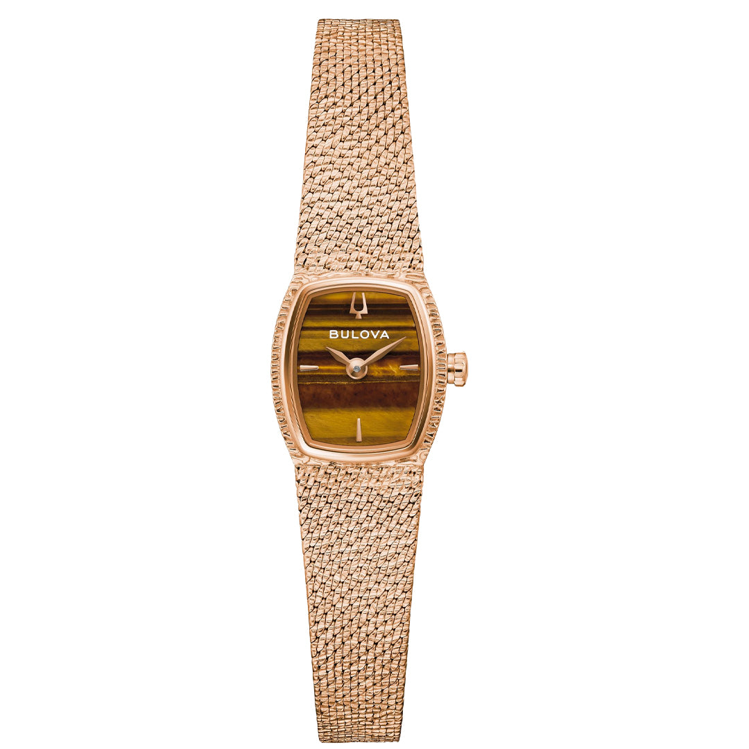 Este elegante reloj presenta un movimiento de cuarzo de 2 manecillas que garantiza precisión y simplicidad. Su caja retro estilo tonneau, realizada en acero inoxidable con acabado PVD oro rosa y un bisel superior de acabado pulido, evoca el diseño icónico de la década. La carátula, una verdadera pieza de arte, está realizada en cristal de ojo de tigre, complementada con indicadores y manecillas en tono oro rosa. Protegiéndola se encuentra un cristal de zafiro abombado, resistente a rayaduras.