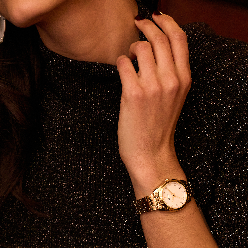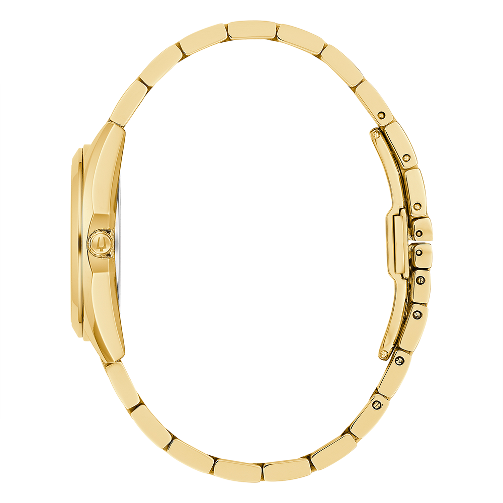 El reloj Surveyor para mujer de Bulova es un reloj clásico que nunca pasará de moda. La caja de acero inoxidable en tono dorado presenta bordes esculpidos y facetados que ofrecen un uso sin esfuerzo en la muñeca, con acabado pulido y cepillado, un cristal de zafiro y un brazalete de acero inoxidable en tono dorado de 3 eslabones a juego con lengüetas de liberación rápida y un Cierre desplegable con pulsador. La lustrosa esfera de nácar ofrece un brillo sofisticado, equipada con 11 índices de diamantes genuinos y un auricular en tono dorado. Con detalles y estilo sorprendentemente bellos, este reloj de mujer Bulova aporta elegancia atemporal a cualquier ocasión.