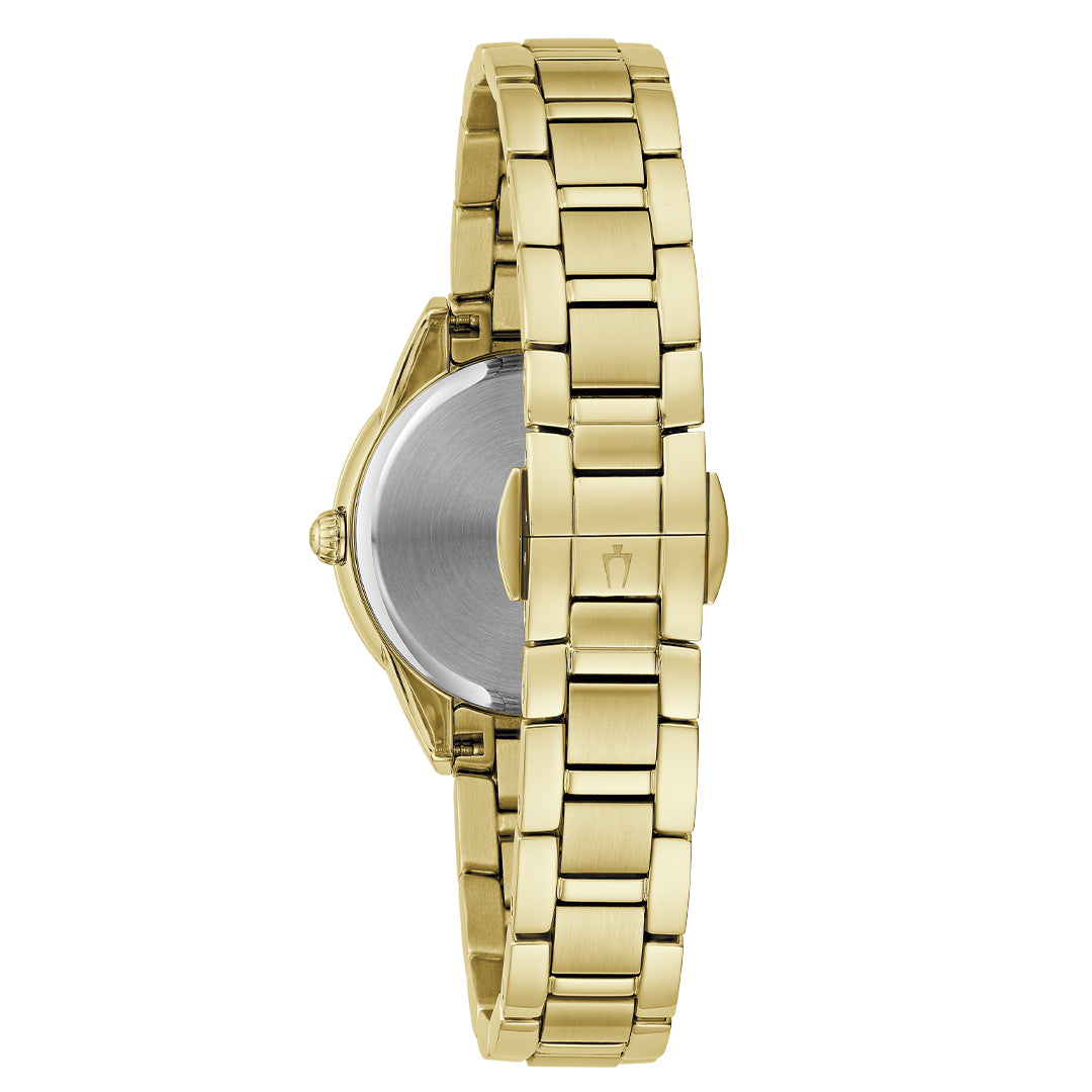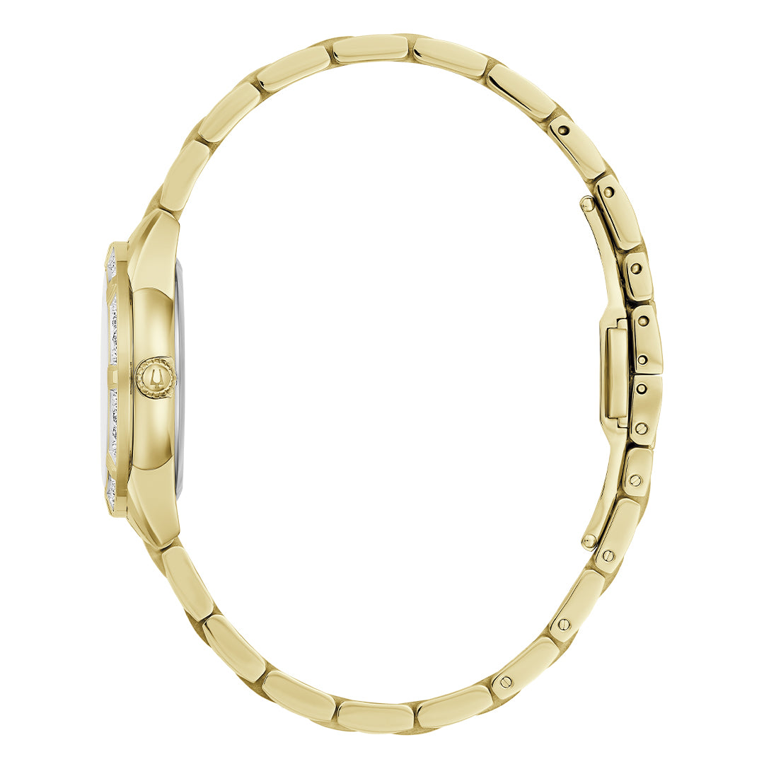 Esta elegante incorporación a la colección Bulova Ladies' Sutton ofrece un reloj sofisticado para cada ocasión. La caja de acero inoxidable en tono dorado está engastada con 16 deslumbrantes diamantes y luce un cristal de zafiro abovedado para una claridad excepcional. La brillante esfera de nácar genuino está adornada con 3 diamantes y agujas e índices dorados. El reloj se completa con un brazalete dorado a juego. Para la mujer refinada, el Bulova Ladies' Sutton ofrece un reloj sin concesiones.