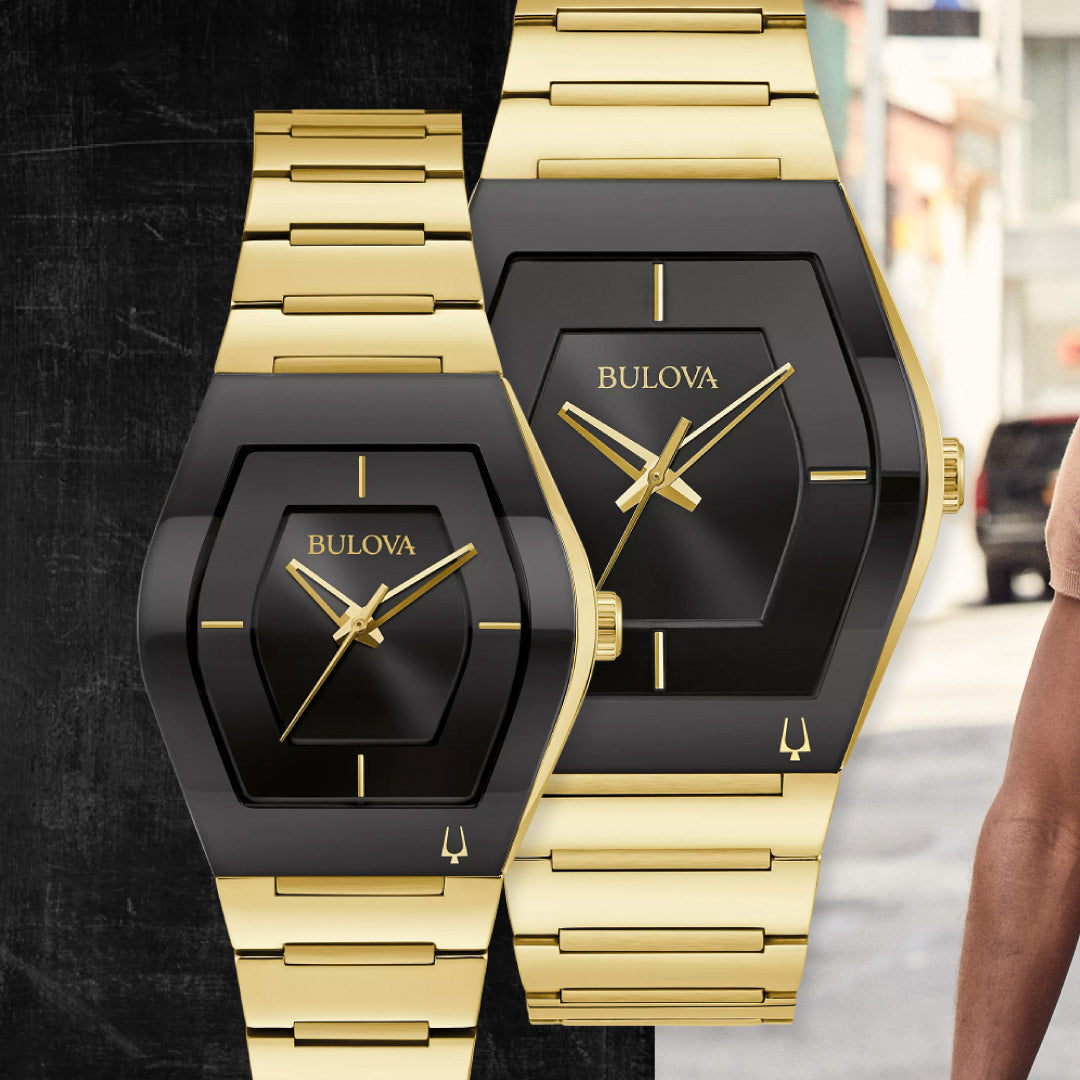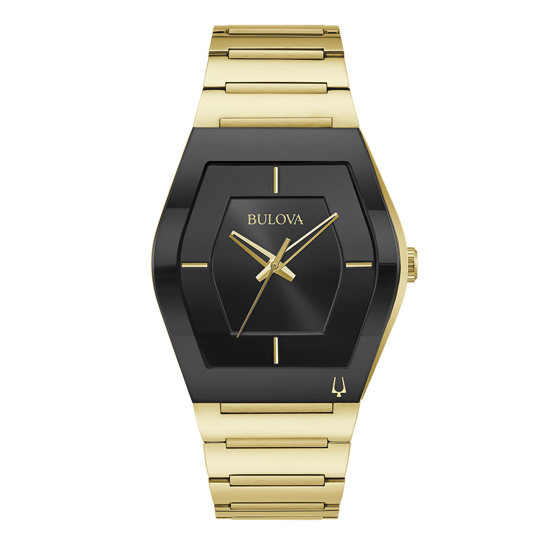 Distintiva caja asimétrica de acero inoxidable en tono dorado con forma de tonel asimétrica con un cristal negro metalizado curvado de borde a borde Futuro característico, una esfera negra con detalles en tono dorado y una pulsera de acero inoxidable en tono dorado. El reloj cuenta con un movimiento de cuarzo de tres manecillas, hebilla desplegable con pulsadores y resistencia al agua hasta 30 metros.