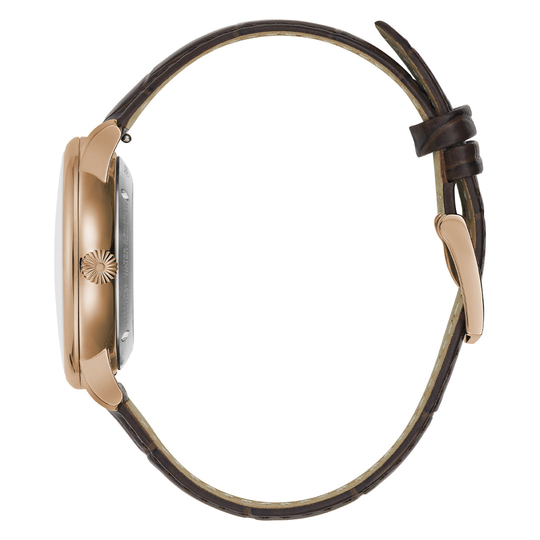 La esfera, una obra maestra de diseño, exhibe cuatro acabados texturales que culminan en un cautivador patrón de tejido de cesta en el centro. Los imponentes números romanos arqueados en las posiciones 6 y 12, junto con los marcadores de bastón en tono oro rosa pulido y la ventana de fecha a las 3 en punto, aportan una estética equilibrada y sofisticada. Las agujas pulidas en tono oro rosa completan este diseño de refinamiento minimalista.