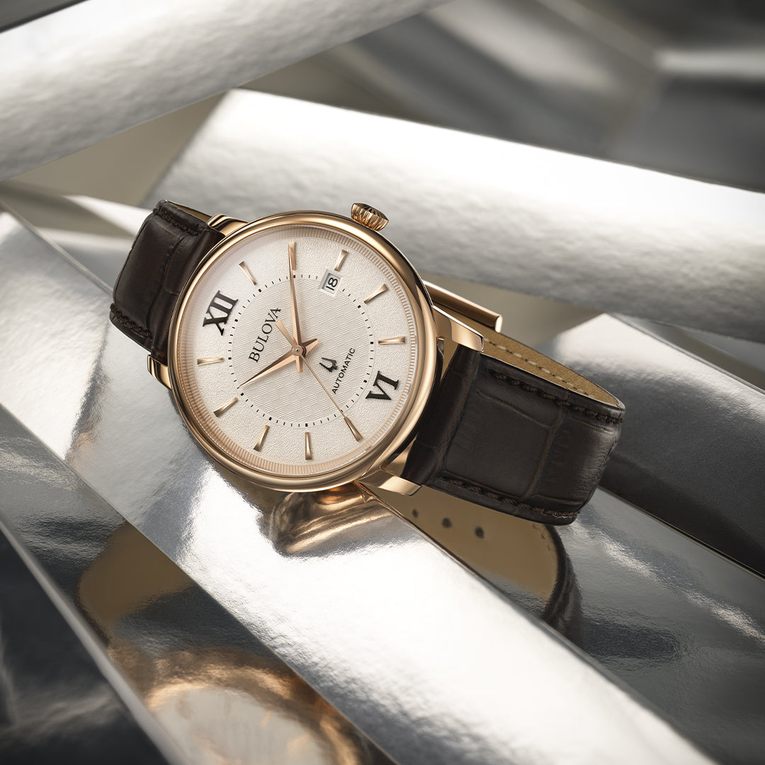 Experimenta la reinterpretación moderna de un clásico con el nuevo Bulova Hudson. Este reloj para hombre presenta un diseño de caja innovador y una esfera meticulosamente detallada, ofreciendo un nivel de sofisticación sin precedentes. La caja de acero inoxidable de 39 mm en tono oro rosa, con su forma convexa y contornos suaves, se adapta perfectamente a cualquier muñeca. El cristal de zafiro doble abovedado, la corona en forma de cebolla y las asas suavemente curvadas completan su elegante perfil.
