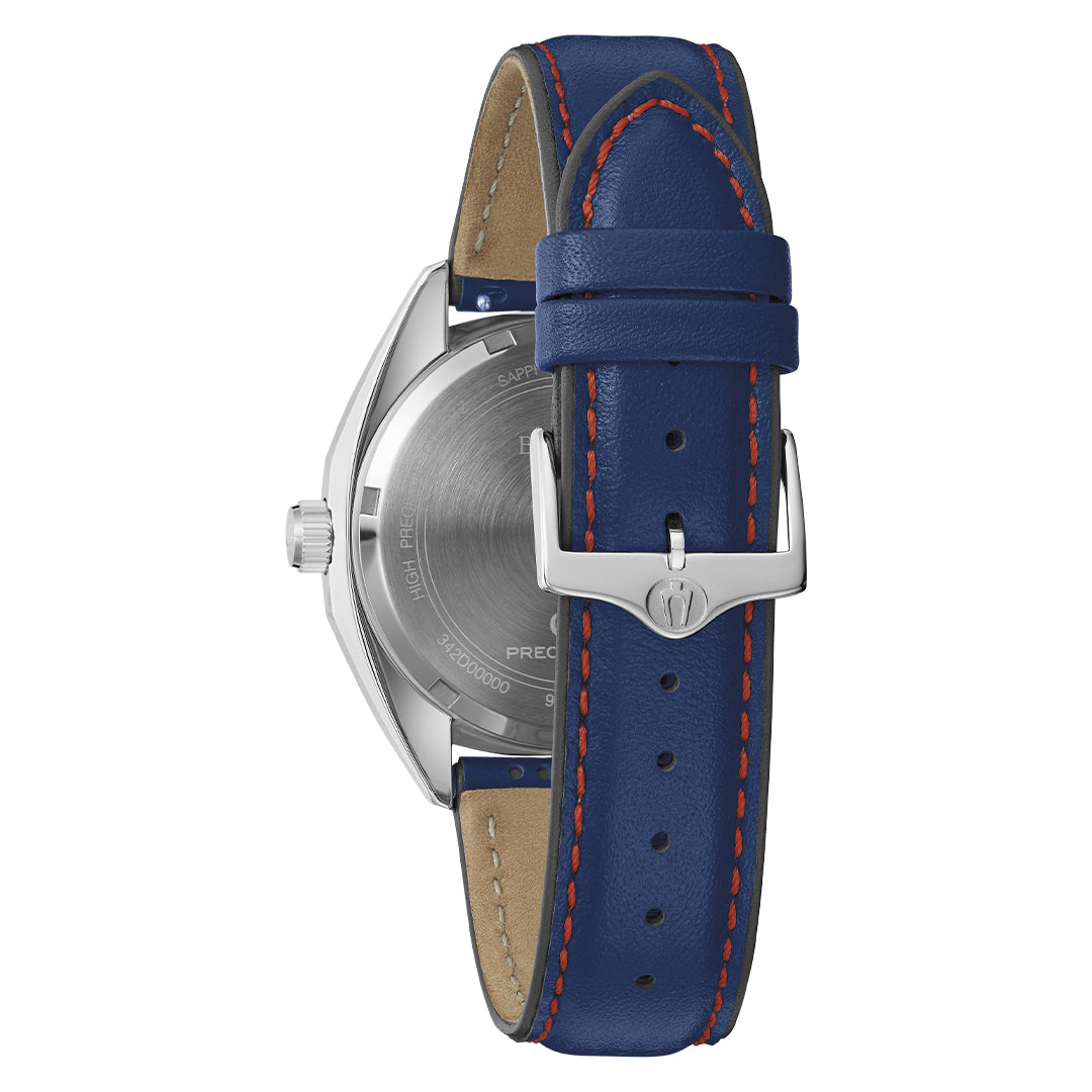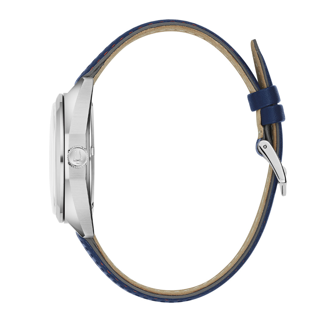Reloj Bulova colección Archivo Histórico “Jet Star†para Caballero. Movimiento HPQ con una frecuencia de 262 kHz, tecnología exclusiva de Bulova de 3 manecillas. Caja y brazalete realizados en acero inoxidable, broche desplegable de doble pulsador. Incluye set de correa intercambiable de piel azul con pespuntes rojos en contraste. Carátula plateada, cabuchones como indicadores y manecillas en tono rojo y azul luminiscentes, segundero de movimiento continuo en azul y fechador. Bisel interno en azul. Cristal de zafiro abombado con tratamiento antirreflejante. Resistencia al agua de hasta 50 metros.