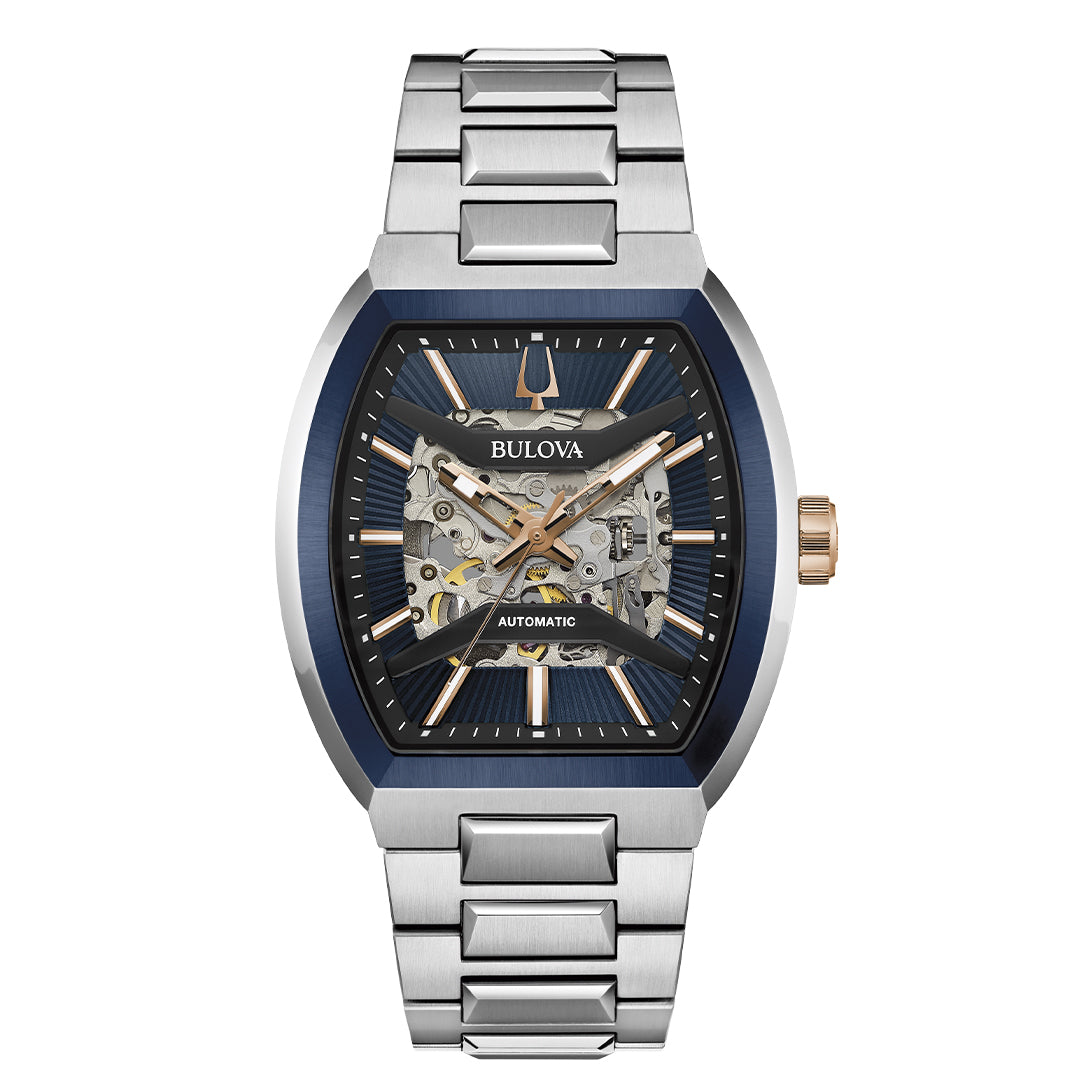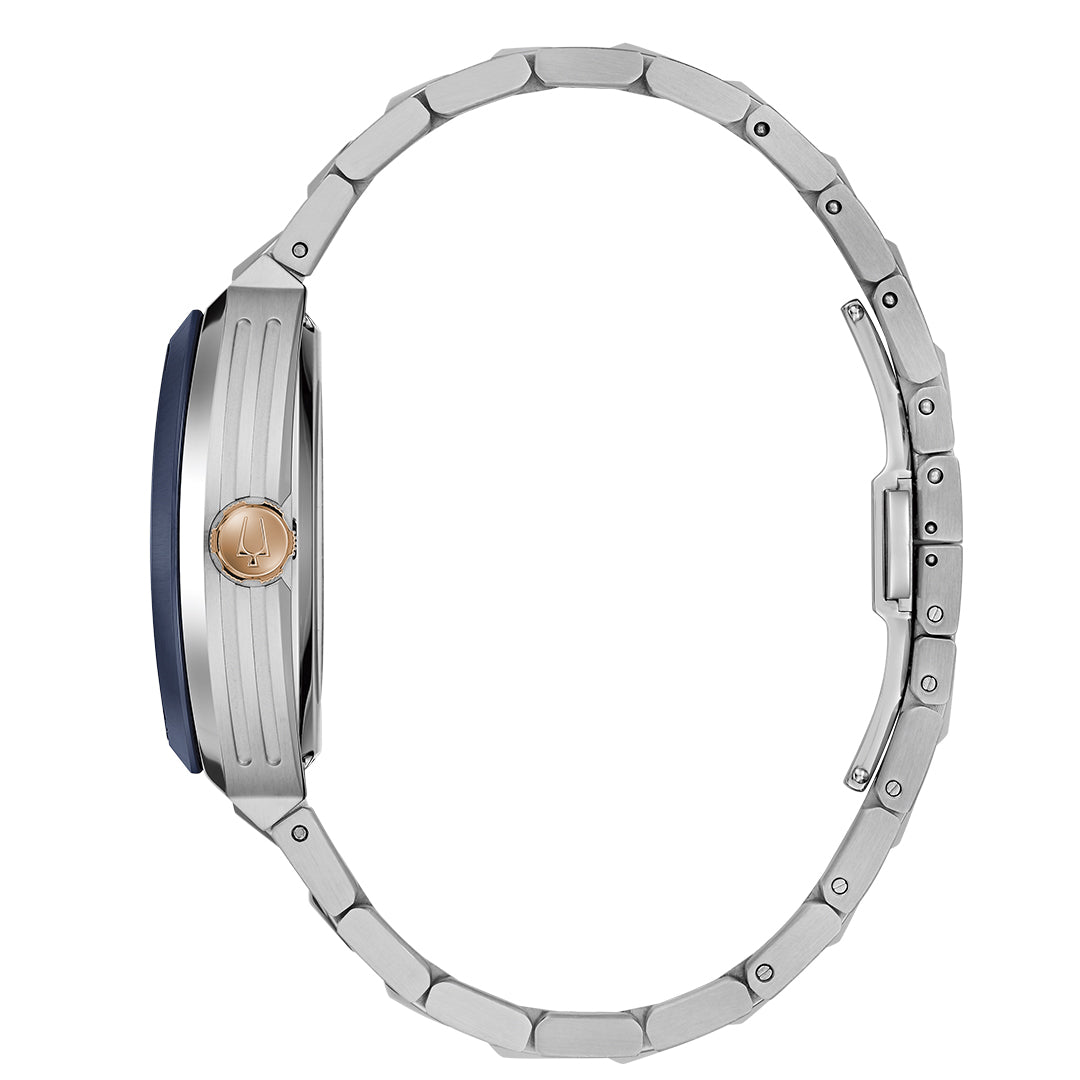 Este reloj Bulova para hombre, de la colección Maquina, ofrece un diseño vanguardista y audaz. Cuenta con una caja de acero inoxidable de 40 mm en tonos oro rosa y plata, con cristal de zafiro curvado, bisel azul y brazalete de acero inoxidable plateado con cierre desplegable con pulsador. La esfera azul estampada, con aro y puentes negros, presenta agujas e índices en oro rosa con relleno luminiscente y una ventanilla central que revela el mecanismo interno del movimiento automático de 21 rubíes, visible también a través de un fondo transparente, esqueletizado y con una reserva de marcha de 42 horas. Con su corazón mecánico y su forma moderna e inigualable, este reloj Bulova para hombre ofrece una expresión de estilo única y personal.