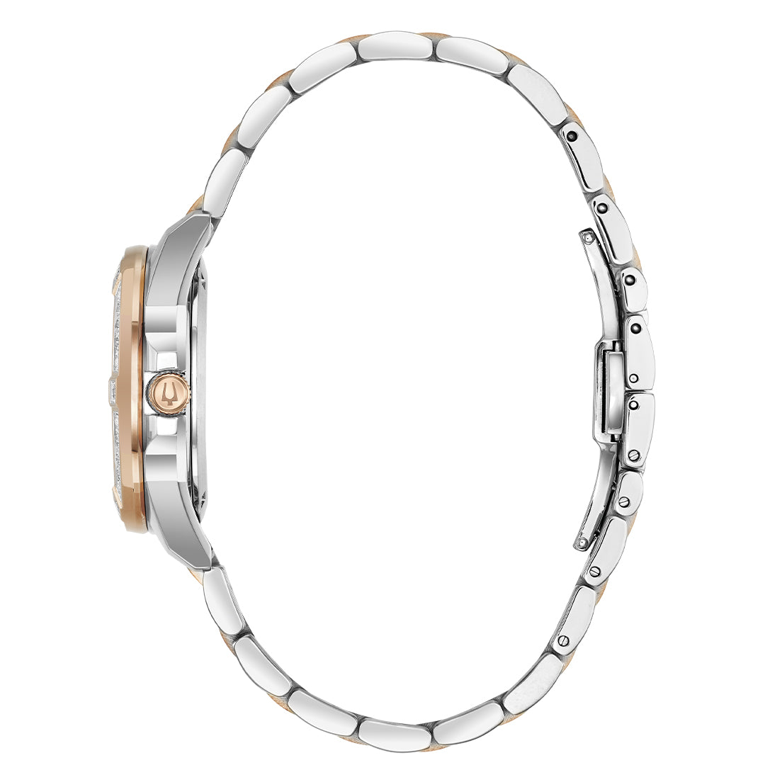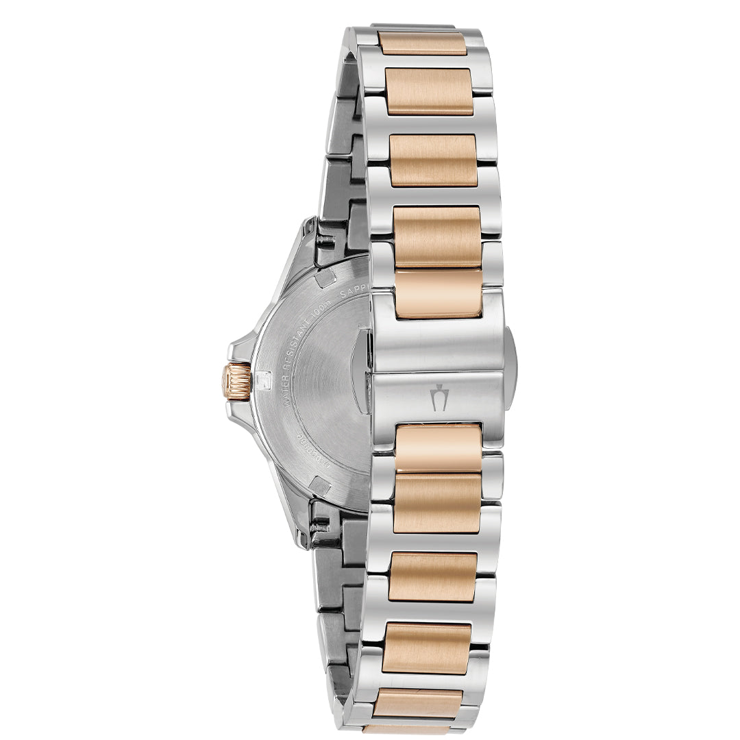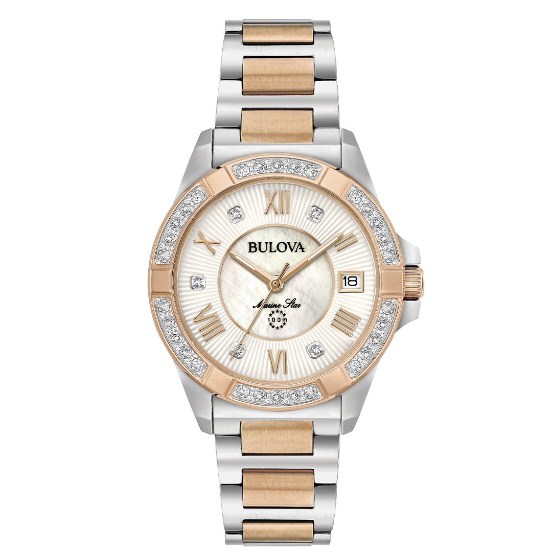 Este hermoso reloj para mujer, de la colección Diamonds de Bulova, actualiza su esfera de nácar Marine Star con brillantes diamantes engastados a mano y detalles en tono oro rosa. Otros diamantes adornan el bisel, mientras que un cristal de zafiro resistente a los arañazos corona la caja de acero inoxidable de 32 mm en tono oro rosa. El brazalete de acero inoxidable en tono oro rosa se cierra con un cierre desplegable. Este reloj para mujer cuenta con movimiento de cuarzo y es resistente al agua hasta 100 metros.