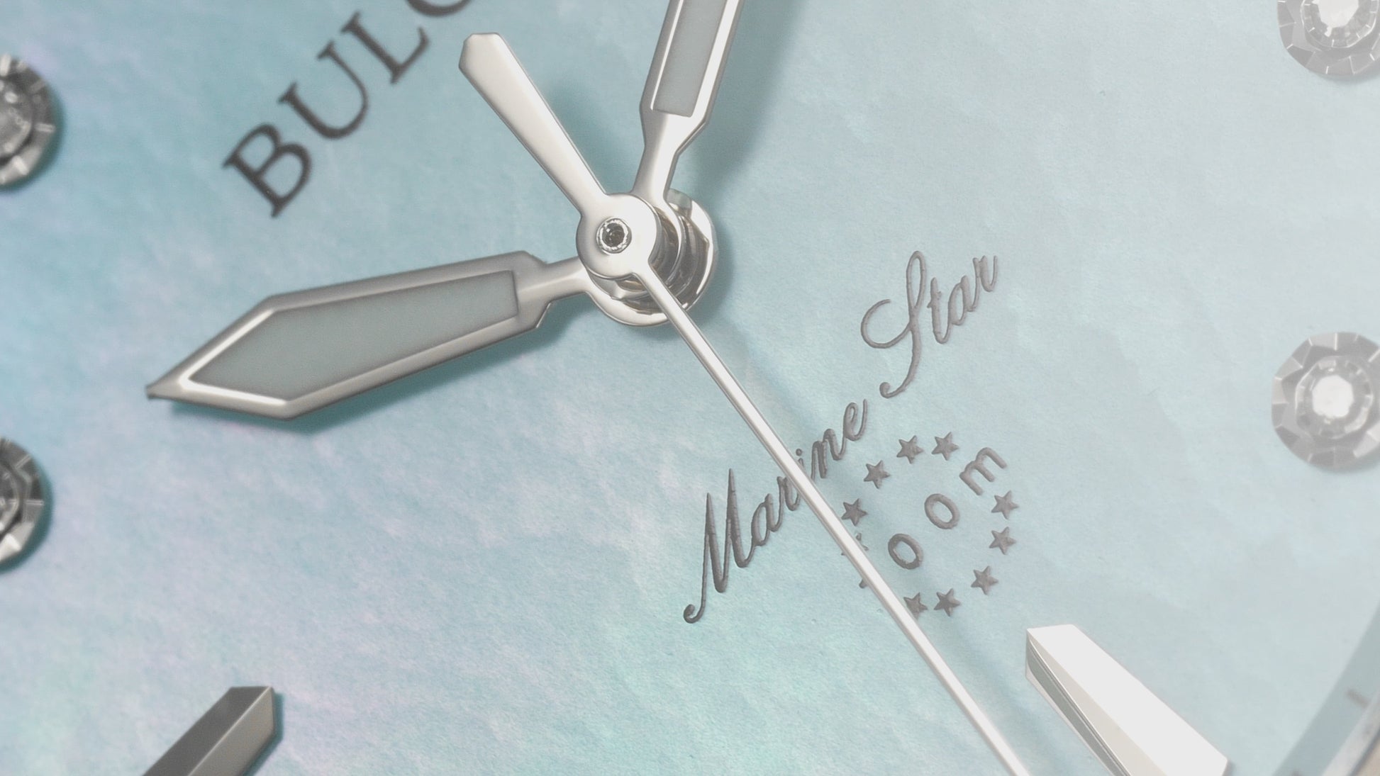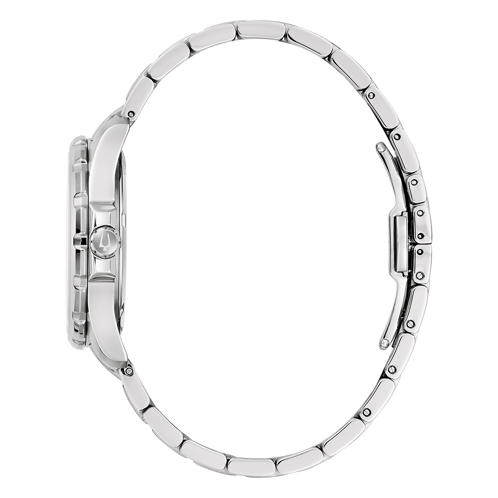 La brillante esfera de nácar azul añade un toque de color al reloj, con ocho marcadores horarios de diamantes y un refinado auricular con relleno luminiscente para una excelente legibilidad en todas las condiciones. El reloj se combina con una pulsera de acero inoxidable de liberación rápida en tono plateado con doble acabado y cierre desplegable con botón que brinda comodidad y seguridad. Para una elegancia atemporal sin importar la ocasión, este reloj de mujer Bulova es el compañero perfecto.