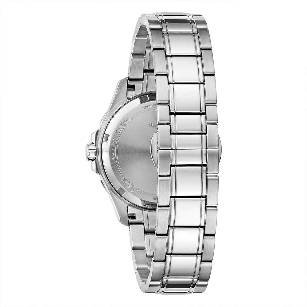 De la legendaria colección Bulova Marine Star, este elegante reloj para mujer ofrece un estilo inigualable. La caja de acero inoxidable en tono plateado presenta un diseño moderno con un bisel fijo almenado audaz y flancos de caja simétricos. Un cristal de zafiro plano y una corona protegida brindan una confiabilidad moderna que se ve reforzada por una resistencia al agua de 100 m.