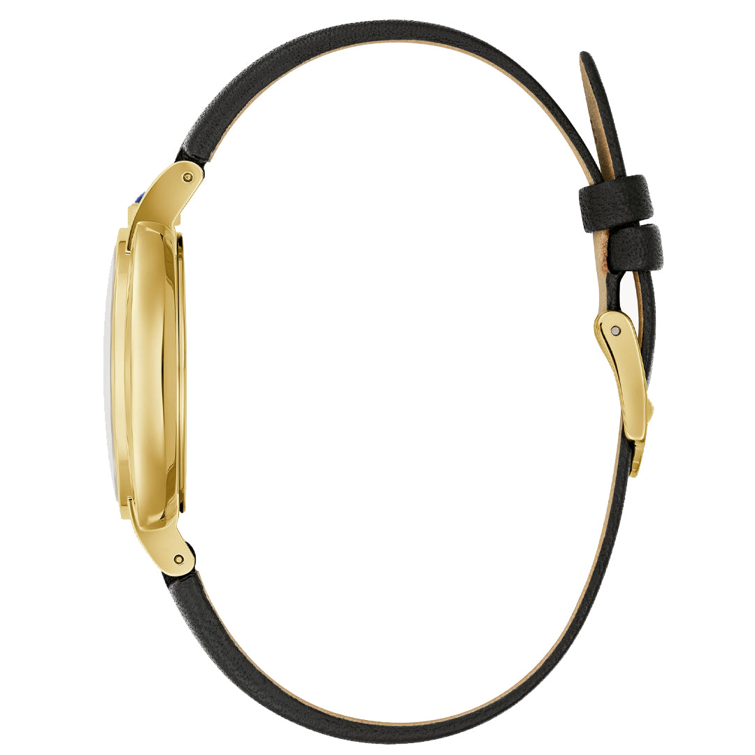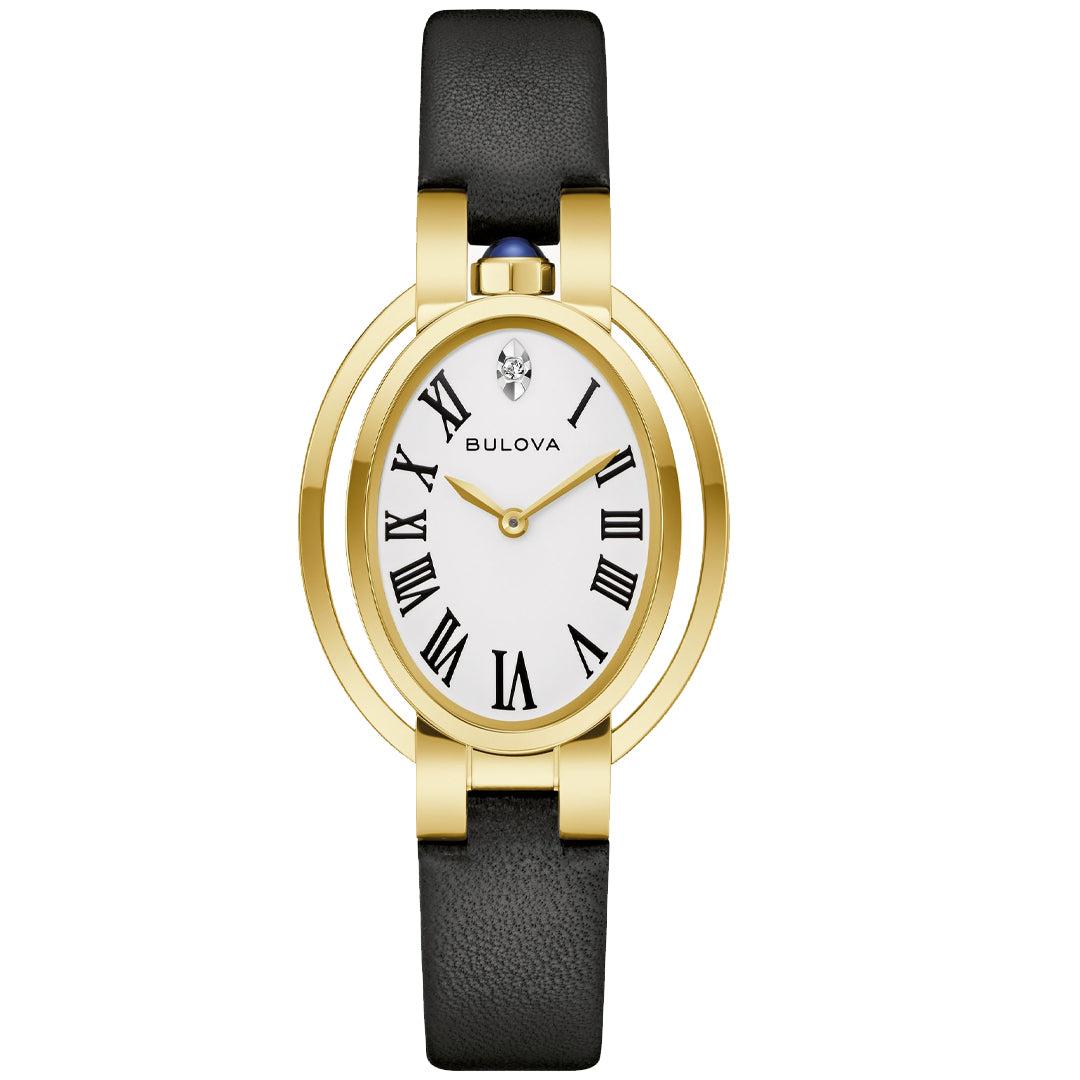 Capturando la conmovedora elegancia de Ella Fitzgerald, este reloj Bulova Rubaiyat Ella Fitzgerald x Apollo, edición especial para mujer, conmemora el histórico debut de la legendaria cantante en el Teatro Histórico del Apollo. La caja ovalada de acero inoxidable en tono dorado, completamente pulida, está rodeada por el halo característico de Rubaiyat, que le aporta dinamismo en la muñeca. La corona a las 12 está engastada con un cabujón de espinela sintética azul, mientras que un cristal de zafiro abovedado garantiza una claridad óptima. La majestuosa esfera de esmalte blanco luce números romanos y un diamante (la piedra de nacimiento de Ella Fitzgerald) engastado en una placa navette de forma marquesa a las 12