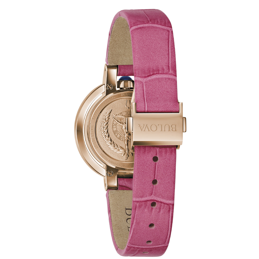 El Rubaiyat captura la esencia de la temporada de floración con 42 zafiros rosas, con un total de 0,25 cts, que rodean su elegante caja de acero inoxidable de 30 mm en tono oro rosa y una corona cabujón de espinela sintética. La llamativa esfera, terminada con un cristal de zafiro de doble curvatura, está cuidadosamente elaborada a partir de rodonita rosa, con un cautivador remolino de color que garantiza que cada esfera sea única.
