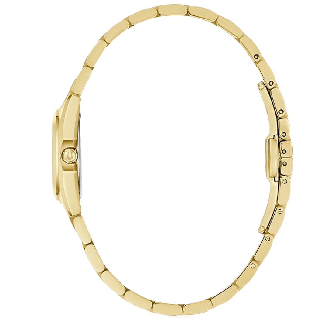 Este reloj cuenta con un preciso movimiento de cuarzo de tres manecillas. La caja y el brazalete están elaborados en resistente acero inoxidable con un lujoso acabado en PVD dorado, asegurado por un broche desplegable de doble pulsador. Destaca su hermosa carátula en color rosa pastel con un delicado efecto de rayos de sol. Los indicadores y las manecillas siguen la paleta de color con un acabado en tono dorado.