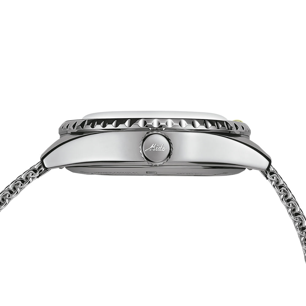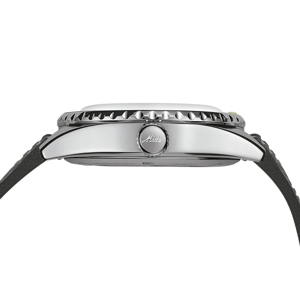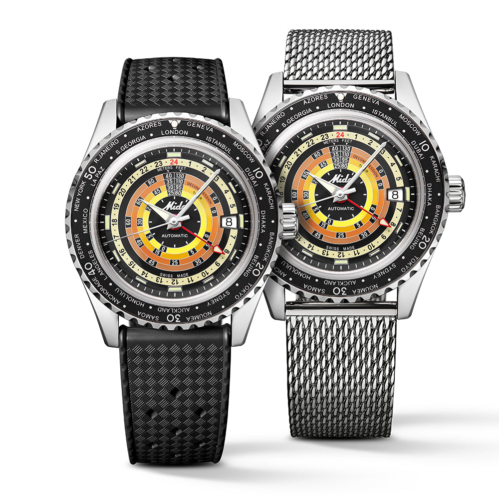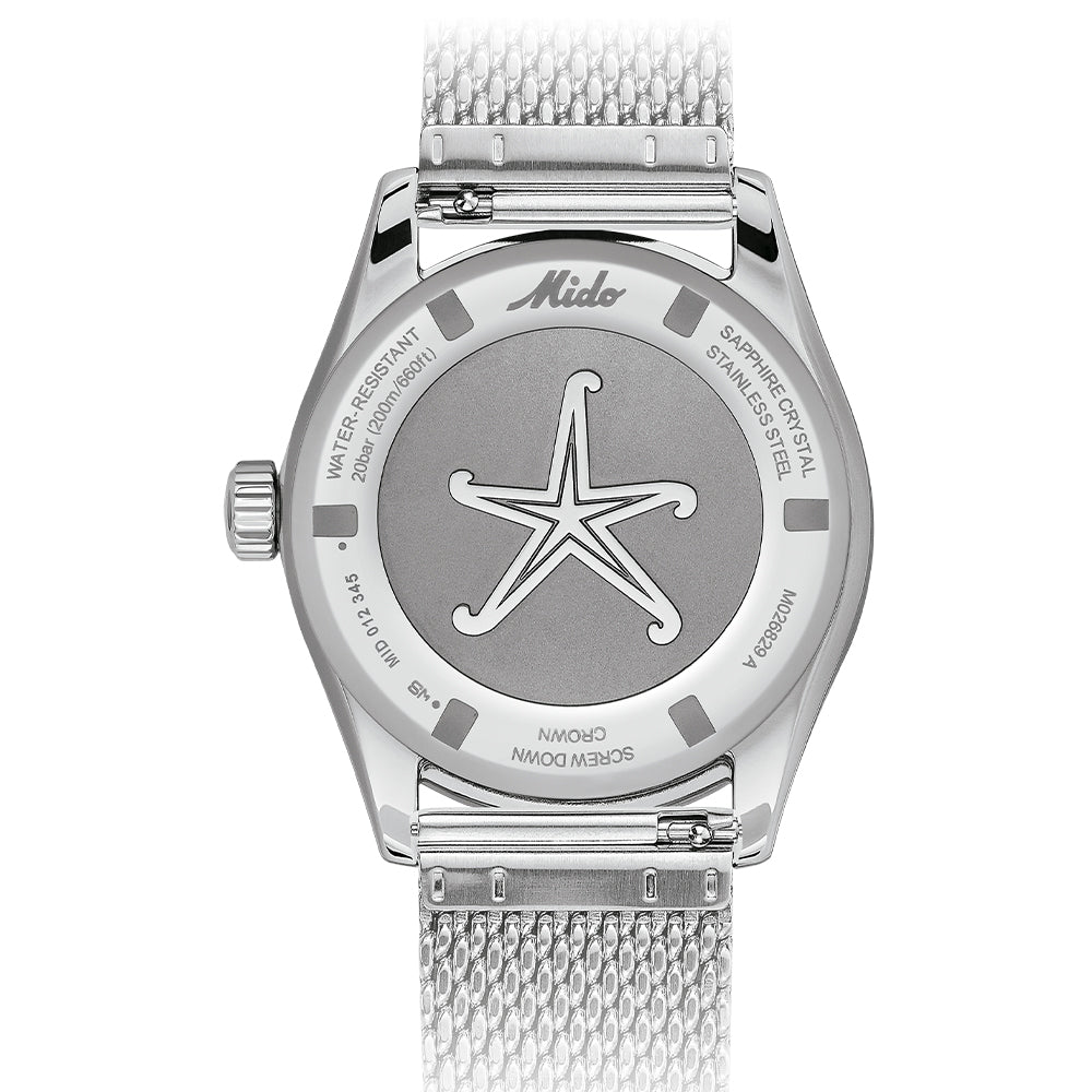 Estilo neo-vintage irresistible, colores brillantes y tecnología de vanguardia: el nuevo Worldtimer de descompresión de Ocean Star conserva este encanto vintage y la adición de una pantalla horaria adicional lo impulsa hacia nuevos horizontes. Mido ha utilizado las últimas tecnologías en su búsqueda continua de excelencia: Super-LuminOva®, un cristal de zafiro de estilo Glassbox, el formidable Calibre 80 con la función Nivachron â„¢ Balance-Spring y GMT, así como una correa adicional de cambio fácil. Una estrella de mar está grabada en la caja de atornillado de este nuevo modelo, que es resistente al agua hasta una presión de 20 bar (200 m/660 pies).