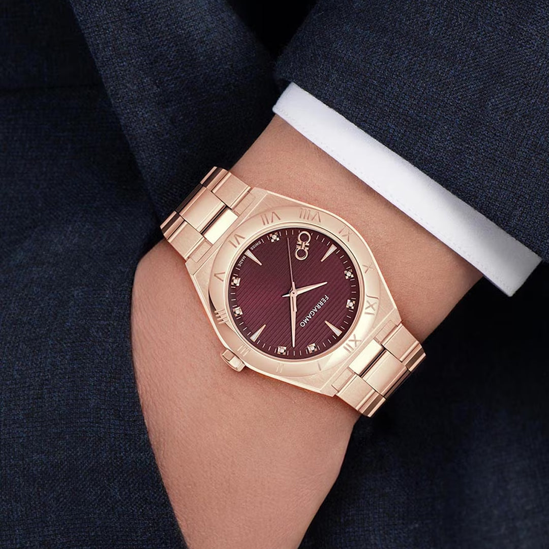El **Salvatore Ferragamo Vega Upper East es un reloj elegante y moderno, con caja de 40 mm en acero, esfera guilloché protegida por cristal de zafiro y el distintivo detalle Gancini. Su movimiento suizo de cuarzo garantiza precisión, mientras que su resistencia al agua de 5 ATM y brazalete metálico lo hacen práctico y versátil para el uso diario o formal.