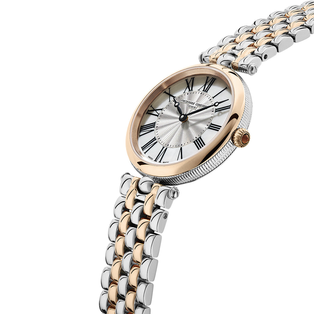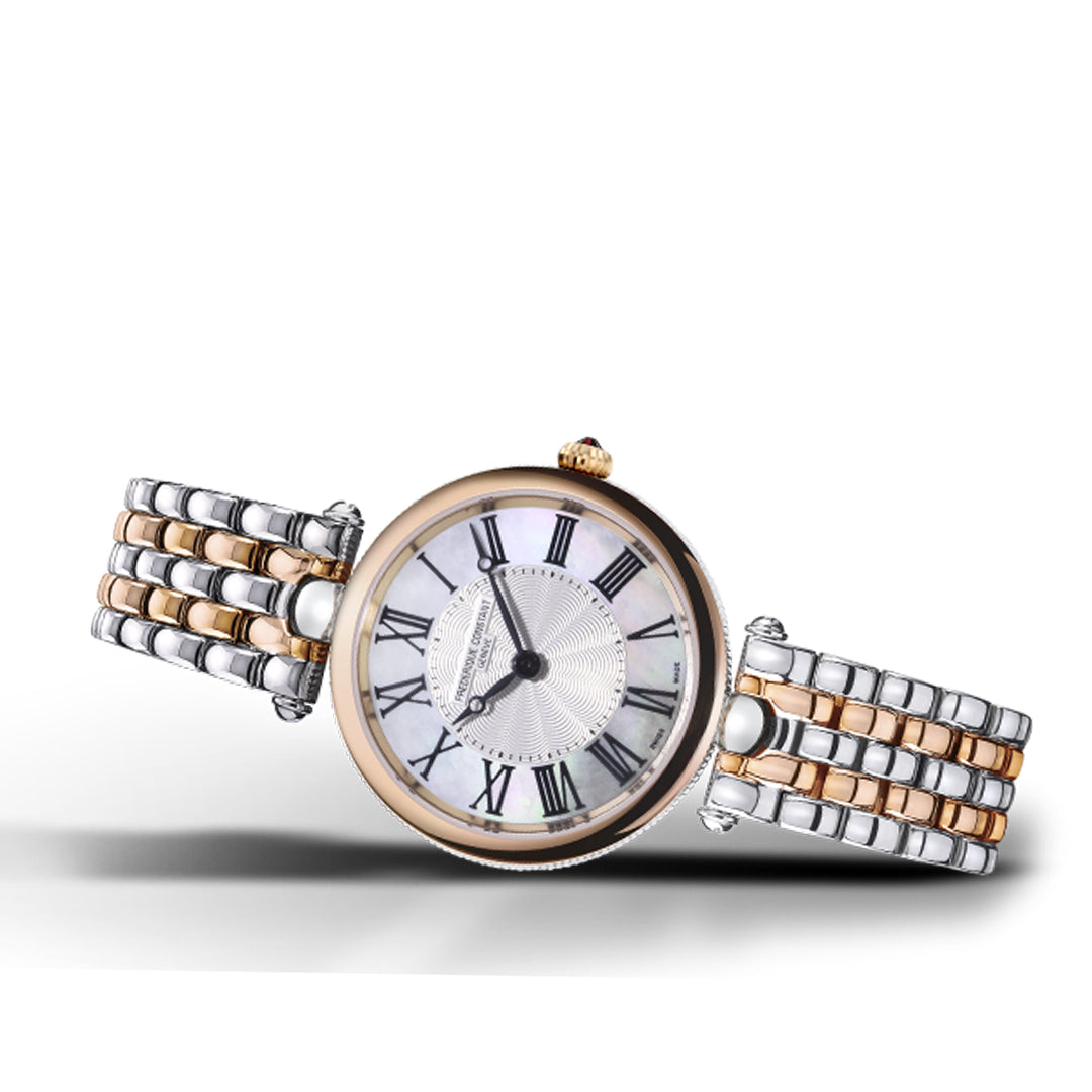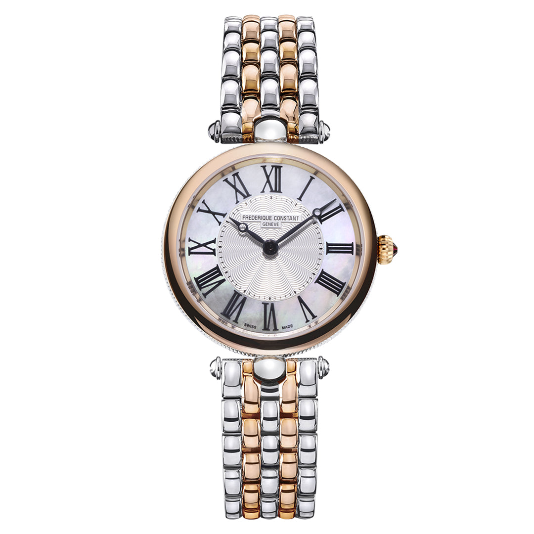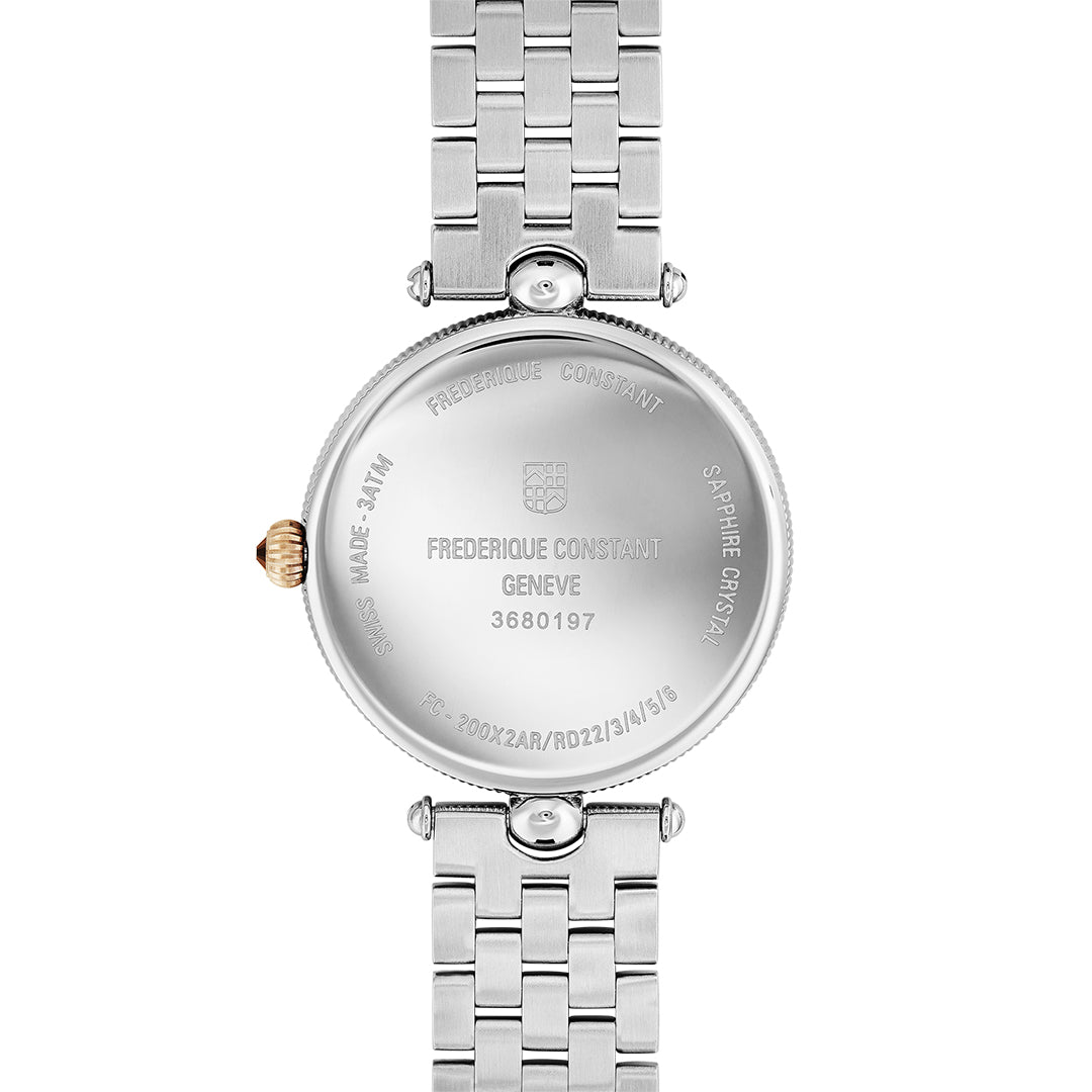 El FC-200MPW2AR2B forma parte de la colección Frederique Constant Classics Art Déco Round. Este elegante reloj de mujer cuenta con una caja redonda de 30 mm, números romanos y una esfera de nácar con motivos guilloché. Tiene una corona adornada con cabujón, lo que le da una estética refinada y similar a la joyería2. El reloj funciona con un movimiento de cuarzo suizo y es resistente al agua hasta 30 metros/100 pies.