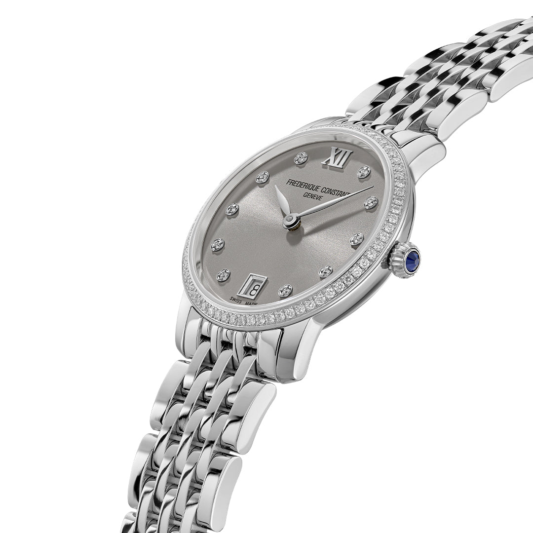 El Frederique Constant FC-220LBD1SD26B forma parte de la colección Classics Slimline Ladies. Cuenta con una caja de acero inoxidable de 30 mm, una esfera marrón con motivo de guilloché y detalles en diamantes, lo que añade un toque de elegancia. Impulsado por un movimiento de cuarzo suizo, garantiza precisión y fiabilidad. El reloj es resistente al agua y viene con un brazalete de acero inoxidable, completando su sofisticado diseño