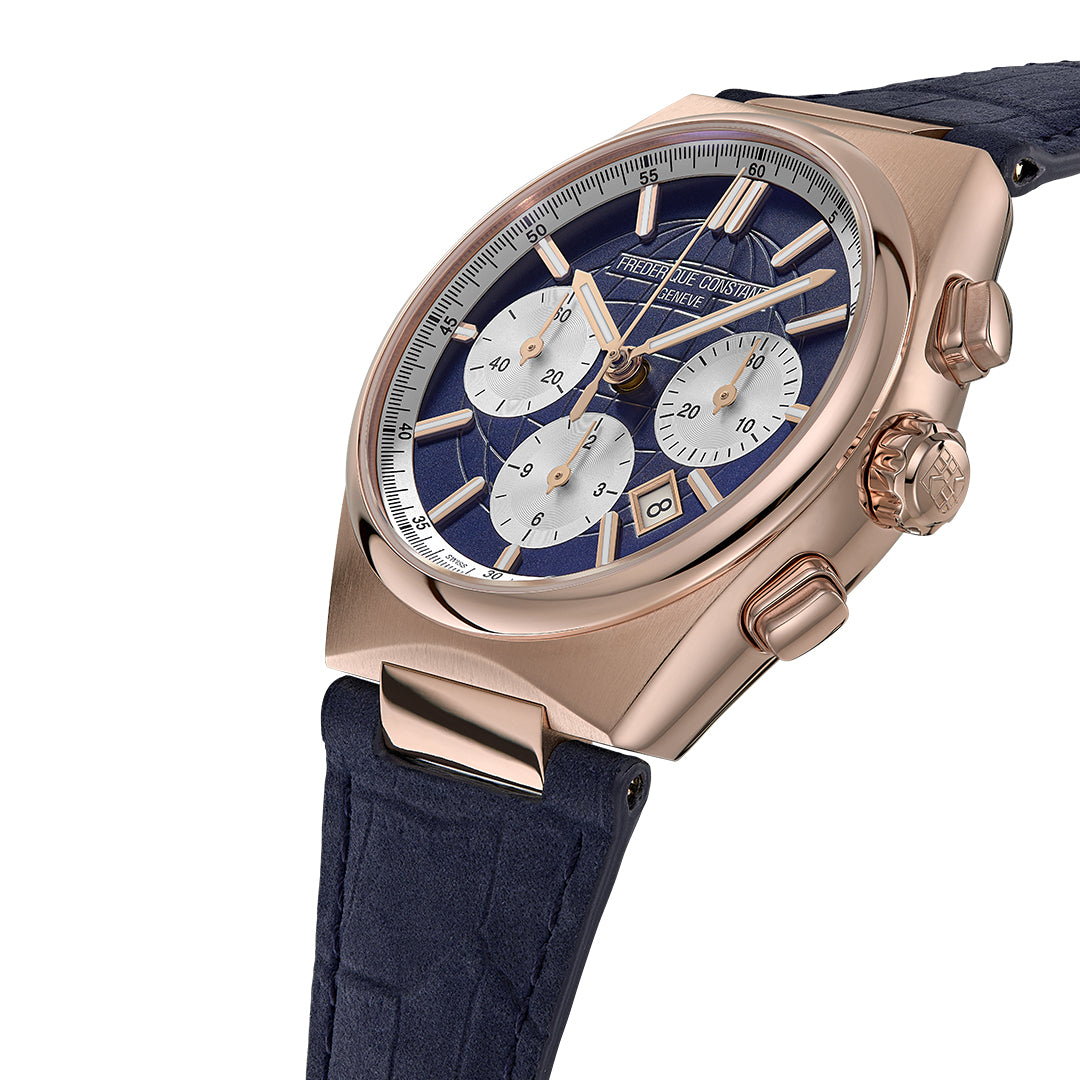 Con ocasión del 25 aniversario de su colección insignia, Frederique Constant propone nuevas versiones de su modelo deportivo, el Cronógrafo Automático de 41 mm. Una versión no limitada con caja chapada en oro rosa y esfera azul medianoche, una combinación muy elegante. Como es habitual, cada pieza, equipada con el calibre FC-391 con una reserva de marcha de 60 horas, viene con varios brazaletes intercambiables