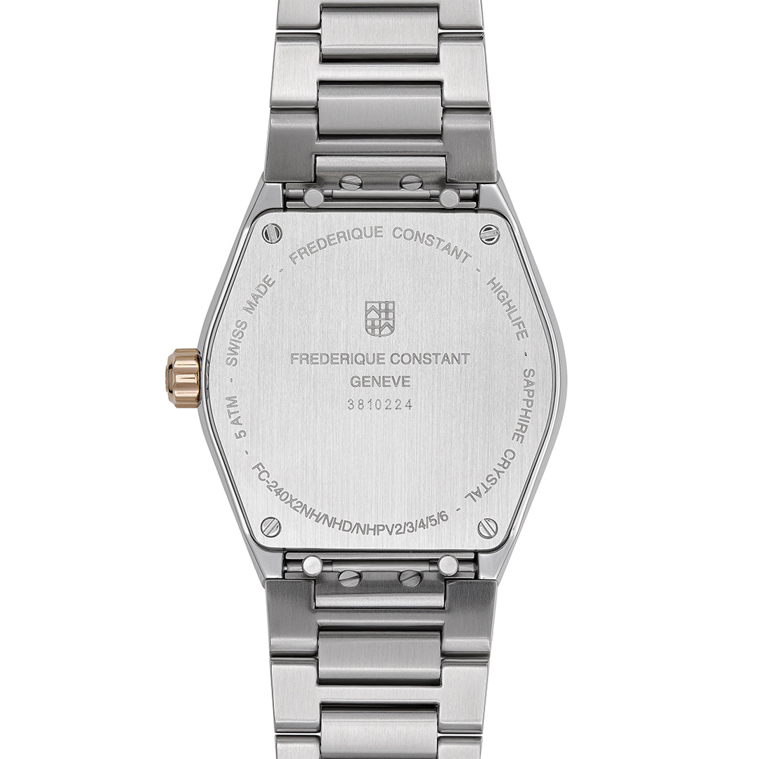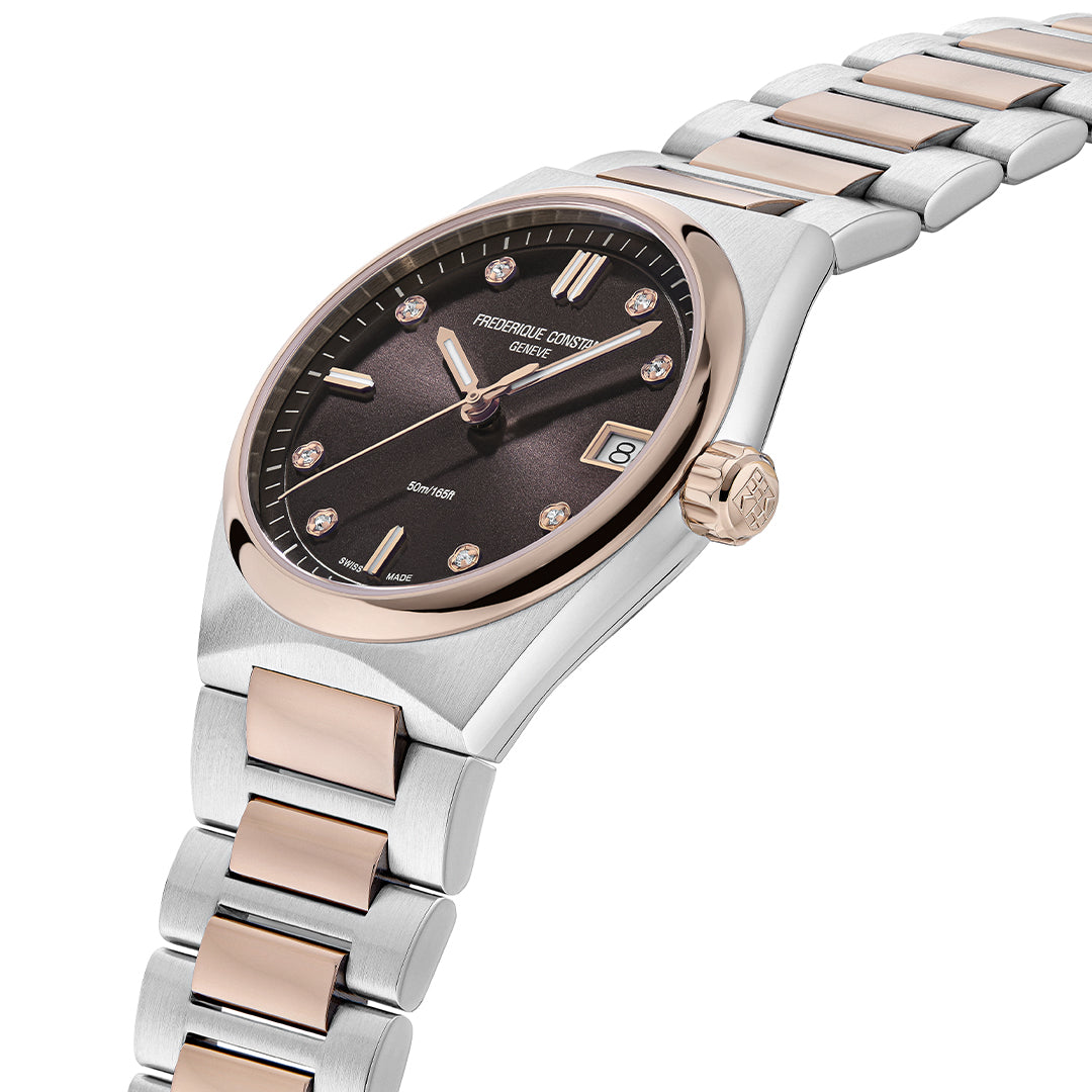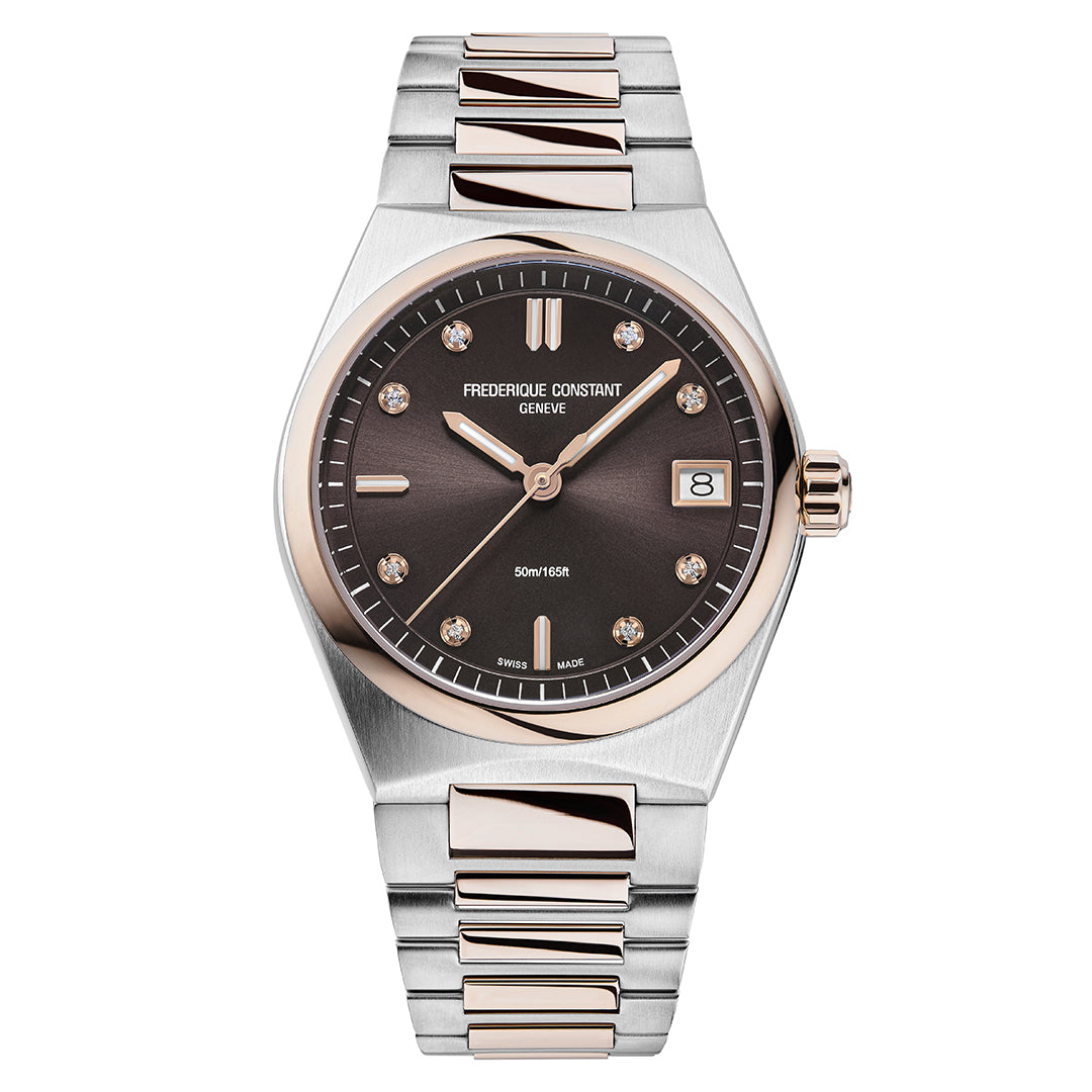 El Frederique Constant FC-240CD2NH2B forma parte de la colección Highlife Ladies Quartz. Este elegante reloj cuenta con una caja de acero inoxidable de 31 mm y tono oro rosa, una esfera marrón oscuro y detalles de diamantes (8 diamantes, 0,04 quilates en total). Incluye una ventana de fecha a las 3 en punto y funciona con un movimiento de cuarzo suizo. El reloj viene con un brazalete integrado de dos tonos y también incluye una correa de caucho blanco para su personalización.