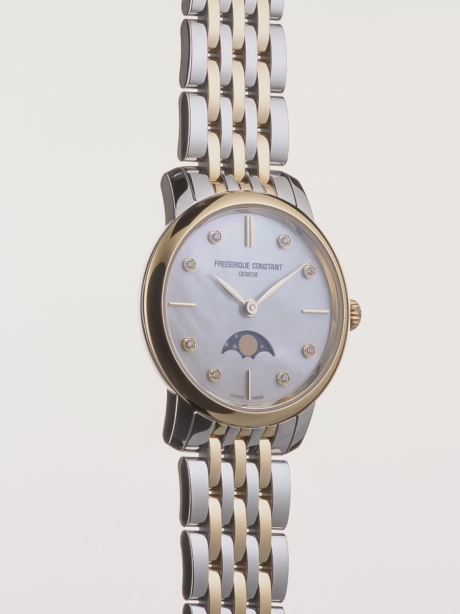 El Classics Slimline Ladies Moonphase fue diseñado para resaltar la suavidad de las curvas de la muñeca, con armonía y sensibilidad, gracias a su caja de 30 mm. Este modelo refinado revela una fase lunar en su esfera de nácar. La colección, preciosa y contemporánea, encarna el saber hacer de Frederique Constant, donde la relojería suiza de lujo sigue siendo accesible y al mismo tiempo ofrece un toque de poesía celestial.