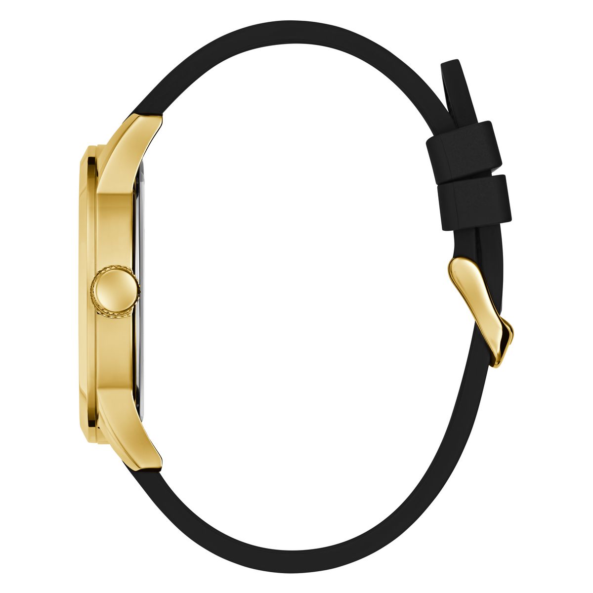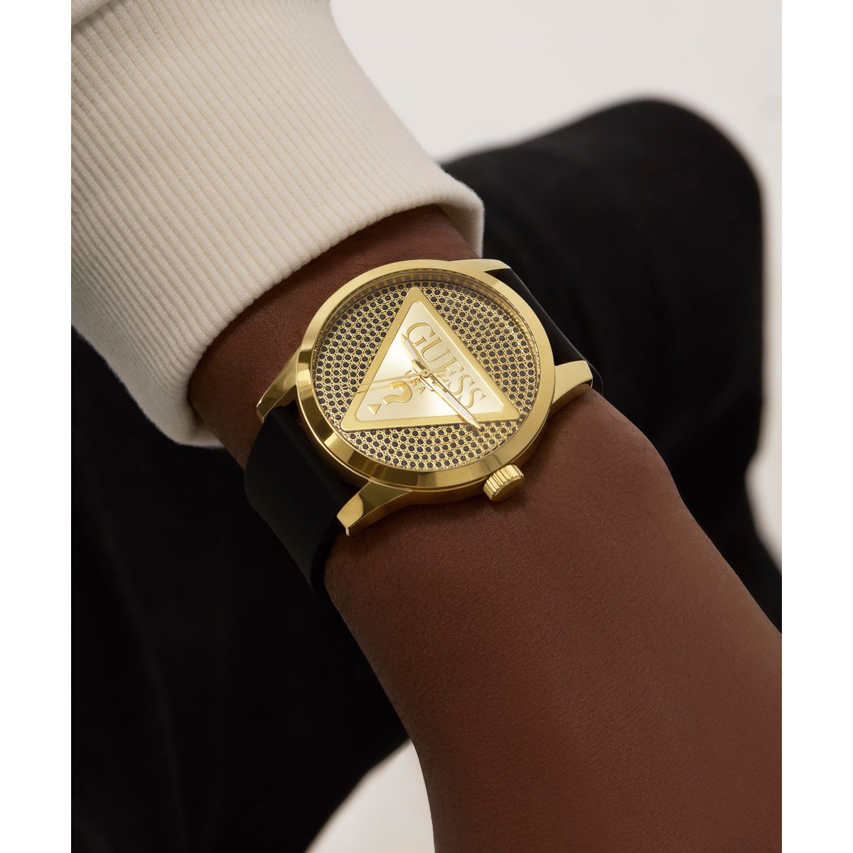 Reloj de hombre Guess con caja de acero reciclado brillante 44mm dorado, esfera de rayos de sol dorado con logotipo triangular Guess dorado y cristales negros, correa de silicona lisa negra. Atrae todas las miradas con el BADGE, un reloj con una composición equilibrada. Diseñado para el hombre moderno que busca estilo y funcionalidad, este reloj presenta una estética robusta y elegante. El logo de GUESS, distintivo y elegante, refuerza su identidad de marca, convirtiéndolo en el complemento ideal para cualquier ocasión