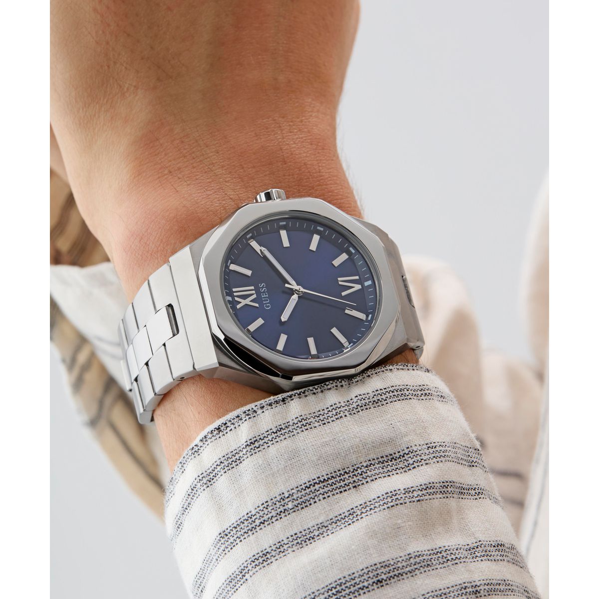 Es un reloj analógico plateado con una caja redonda y octogonal (aunque algunas descripciones simplemente indican "redonda"). La correa es de acero inoxidable cepillado y pulido. El color de la esfera suele describirse como gris, aunque algunos anuncios mencionan una esfera azul para el mismo número de modelo.