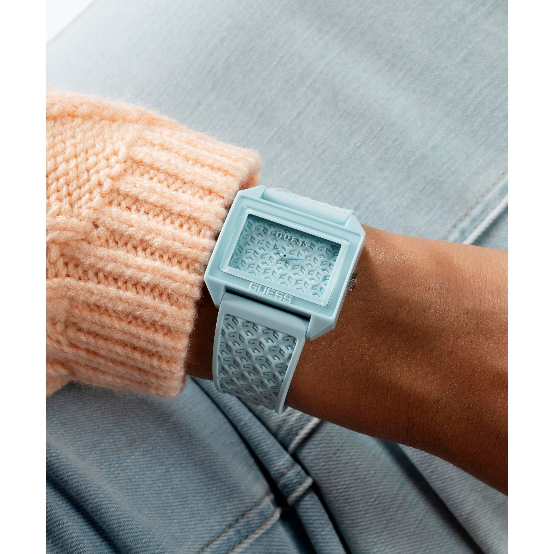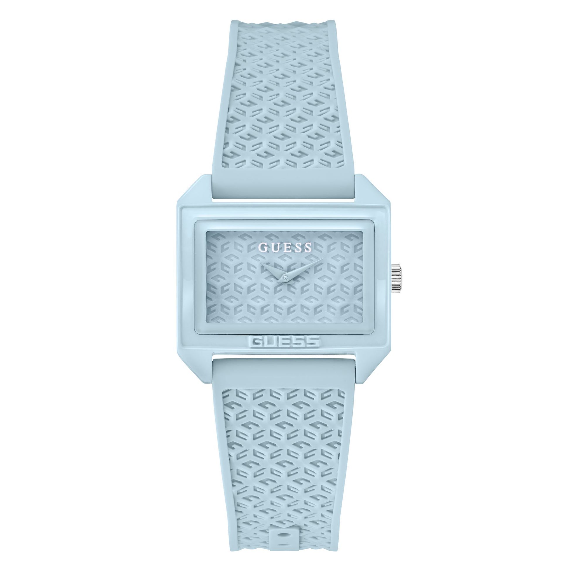 ¡Dale un toque especial a tu look con este nuevo y divertido estilo de logotipo con una caja de nailon sostenible y una correa de silicona con un logotipo de cubo "G" repetido que se extiende desde ambas correas hasta la esfera!