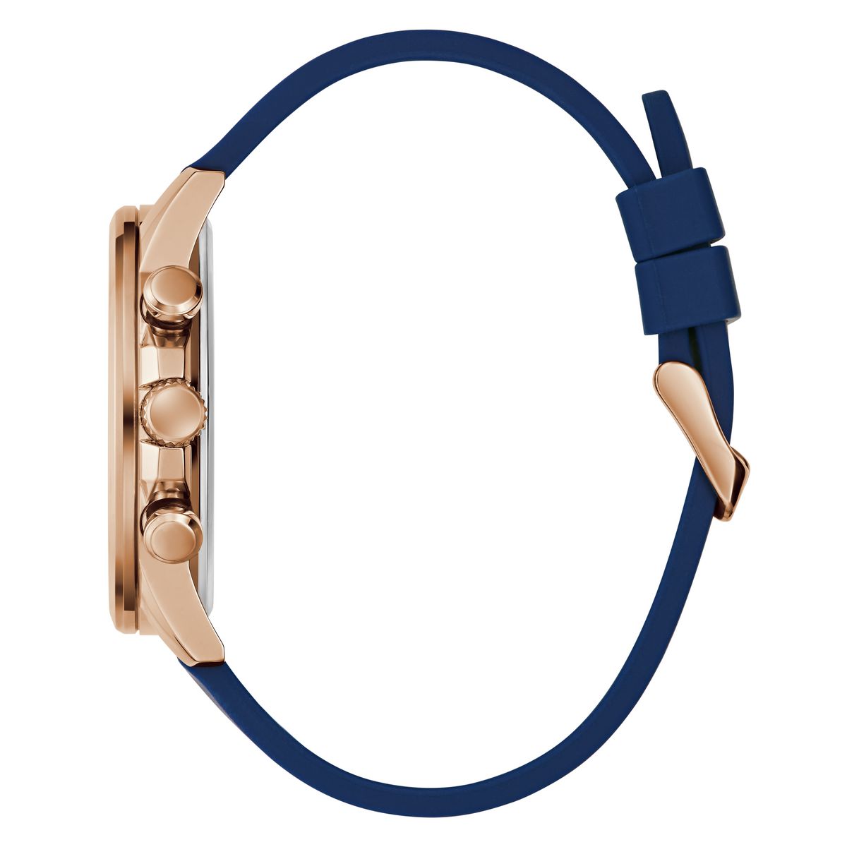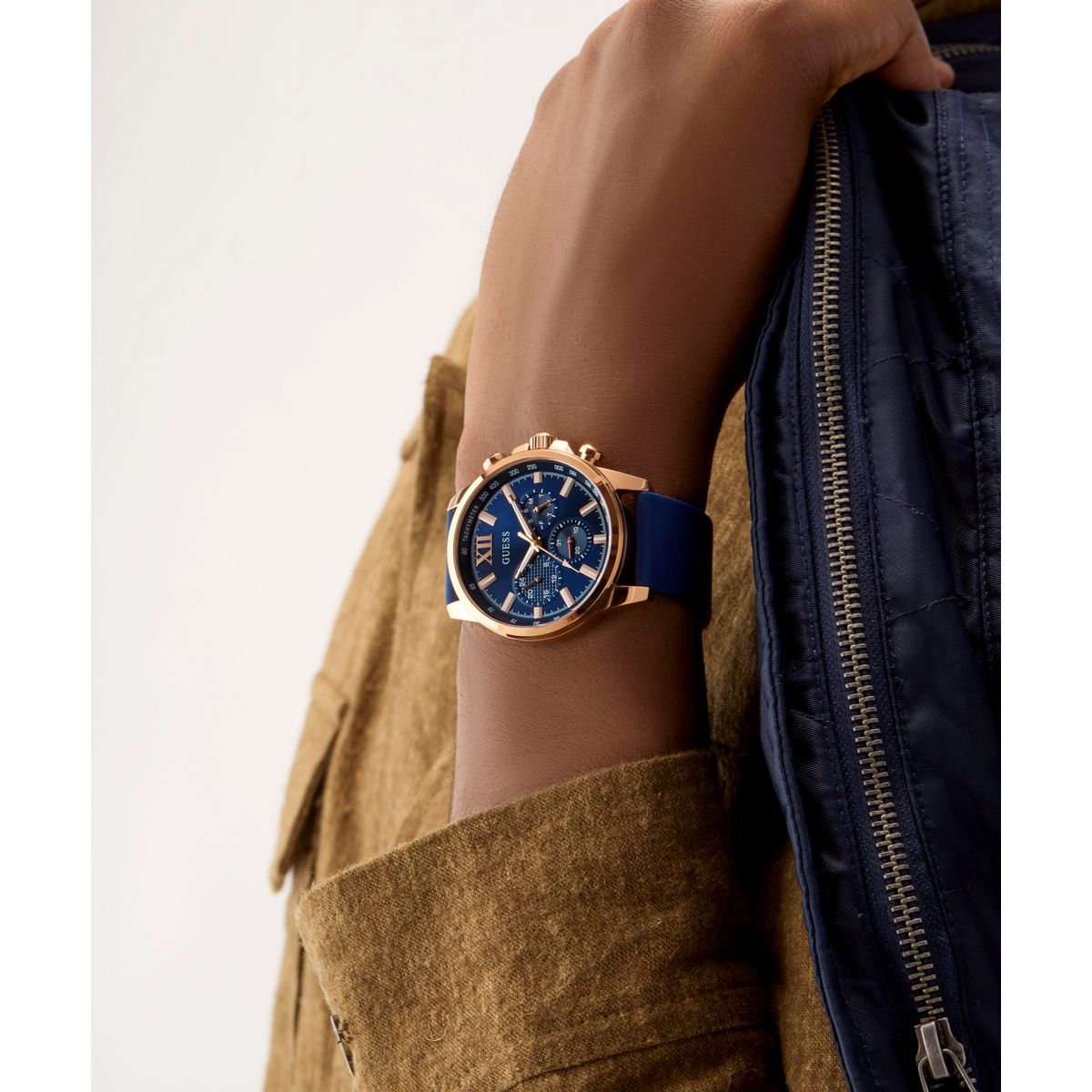 Presenta un estilo elegante y sobrio con un toque deportivo. La caja de acero inoxidable en tono oro rosa ofrece un lujoso contraste con la esfera multifunción azul intenso y la correa de silicona azul a juego. Está diseñado para ser un básico versátil en cualquier reloj.