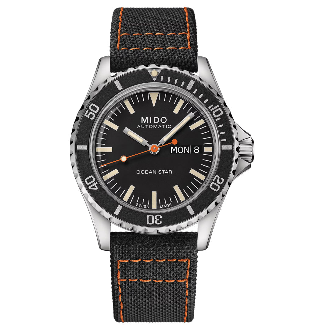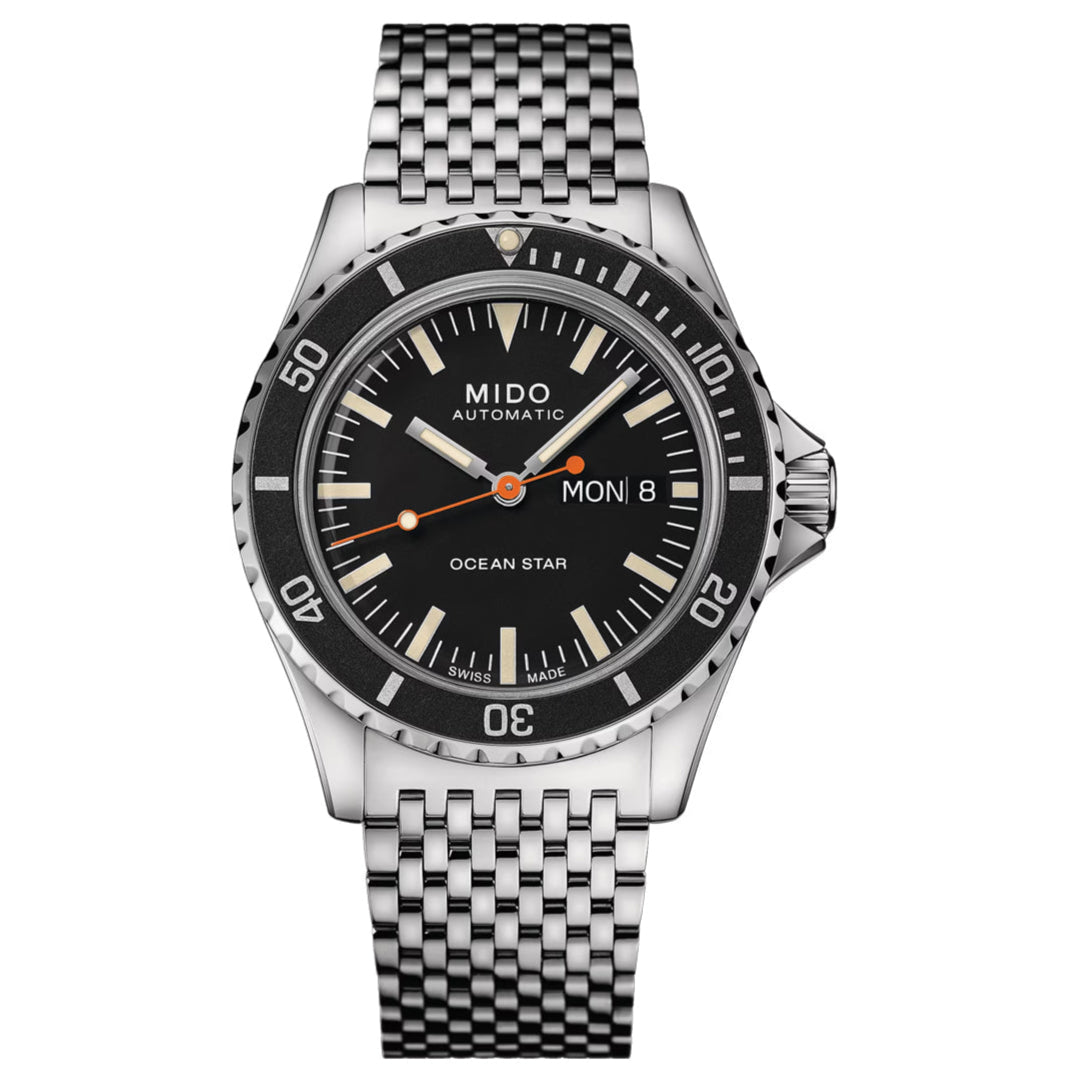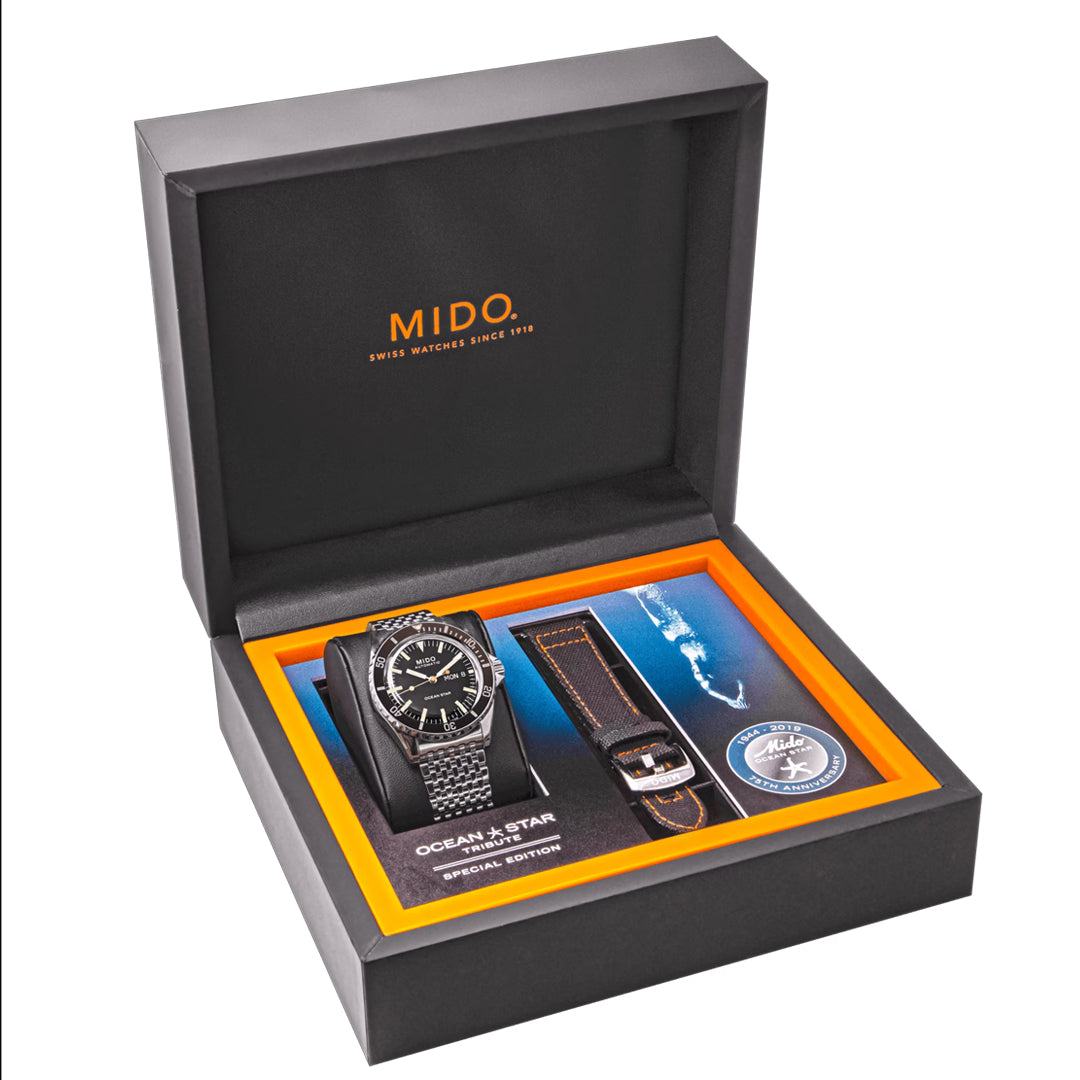 Mido rinde homenaje a la colección Ocean Star. En una sutil referencia al pasado, el reloj Ocean Star Tribute Swiss reinterpreta los códigos estéticos de los modelos de buceo de los años 60. Está equipado con el movimiento automático Calibre 80 con hasta 80 horas de reserva de marcha, es resistente al agua hasta una presión de 20 bar (200 m/656 pies) y presenta una correa única que ofrece la máxima comodidad.