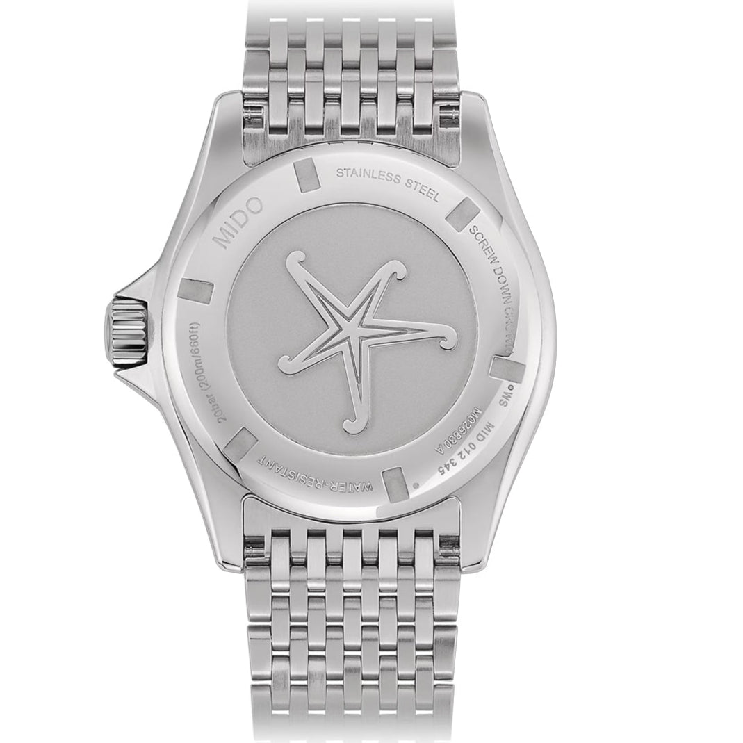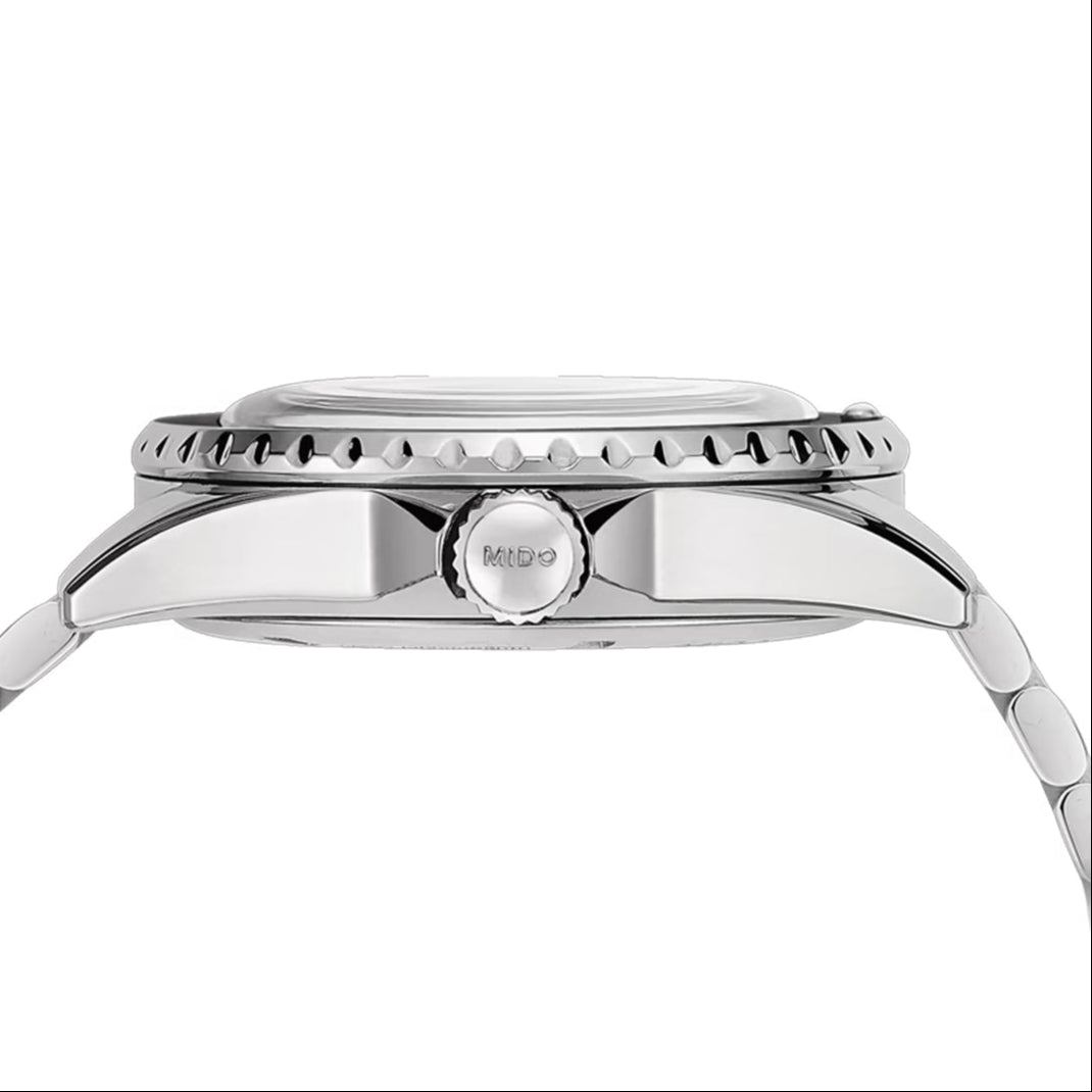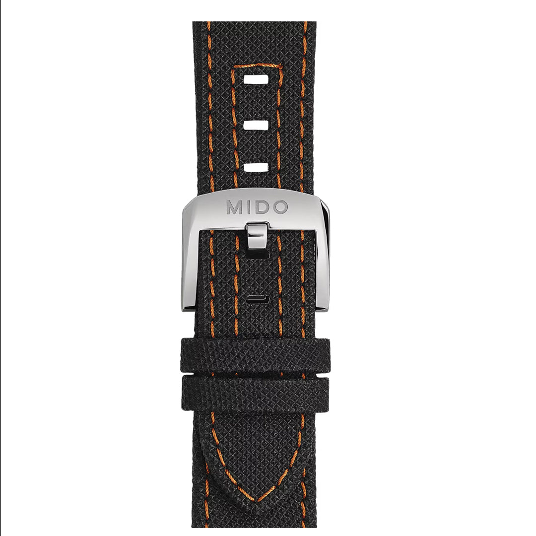 Mido rinde homenaje a la colección Ocean Star. En una sutil referencia al pasado, el reloj Ocean Star Tribute Swiss reinterpreta los códigos estéticos de los modelos de buceo de los años 60. Está equipado con el movimiento automático Calibre 80 con hasta 80 horas de reserva de marcha, es resistente al agua hasta una presión de 20 bar (200 m/656 pies) y presenta una correa única que ofrece la máxima comodidad.
