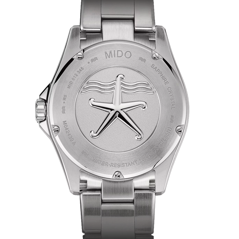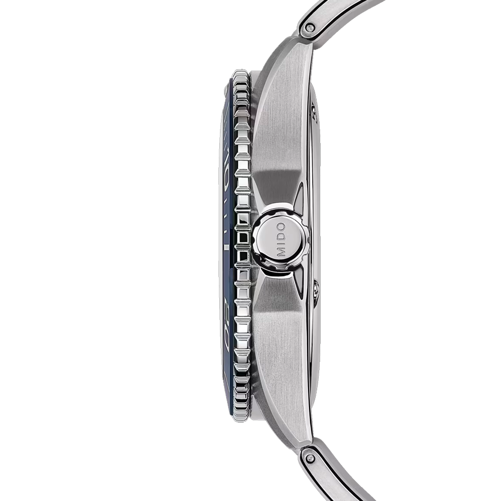 Mido lleva la cerámica, uno de los materiales más destacados de la relojería, al bisel giratorio unidireccional de su reloj deportivo suizo Ocean Star 200C. La carátula está decorada con una textura ondulada y ofrece índices aplicados individualmente recubiertos con Super-Luminova® blanco.