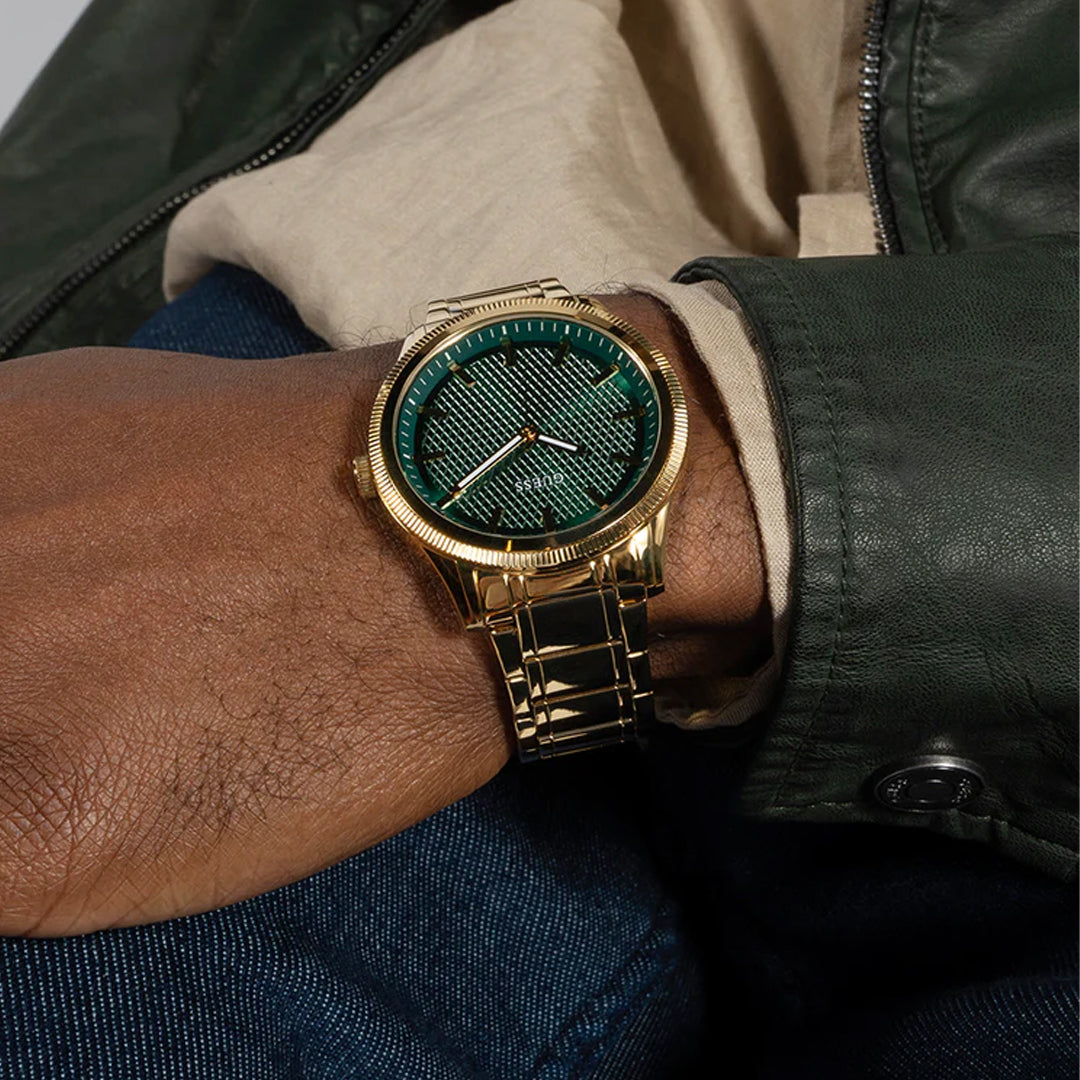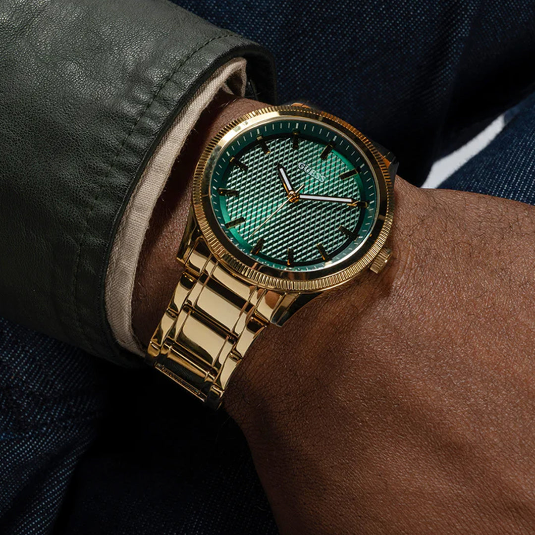 Este sofisticado reloj de vestir, una opción fácil de incluir en el guardarropa de cualquier hombre, presenta un refinado patrón texturizado tanto en el bisel como en la esfera.