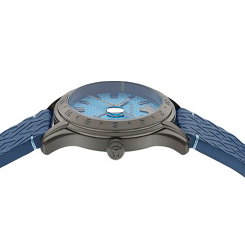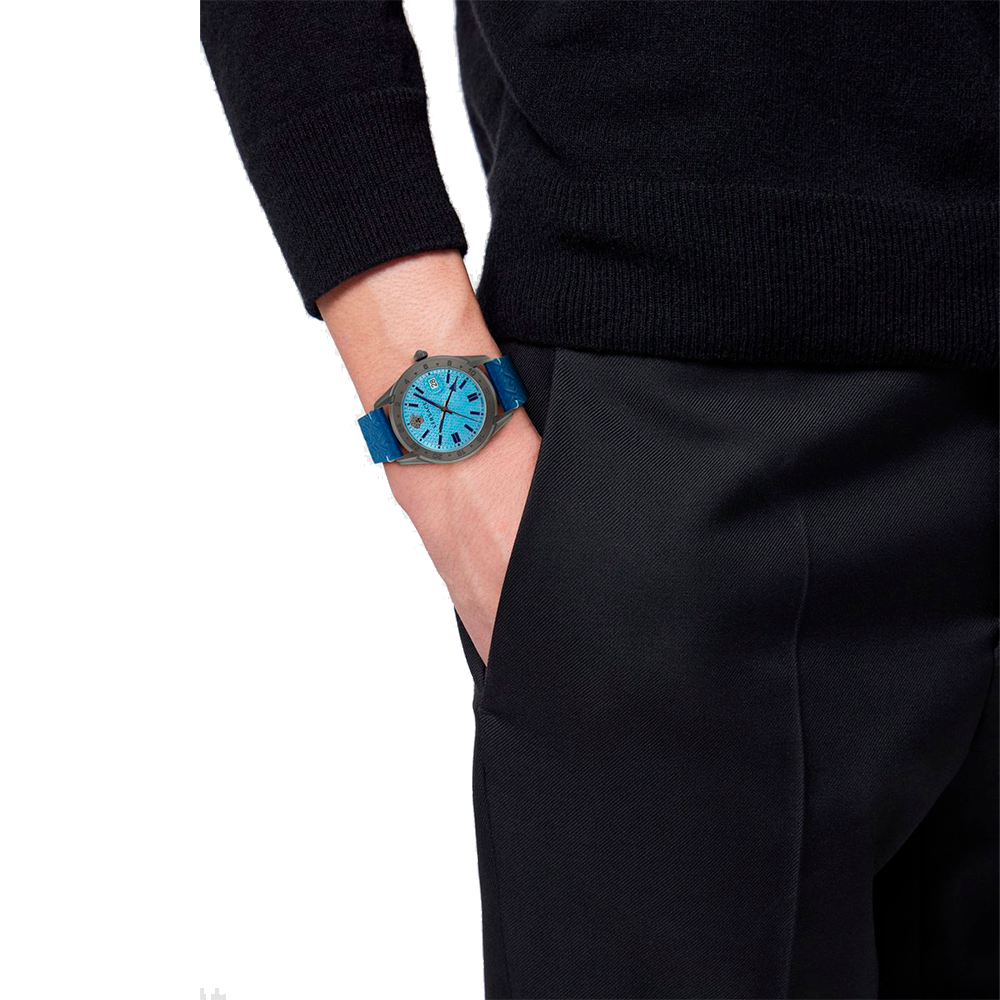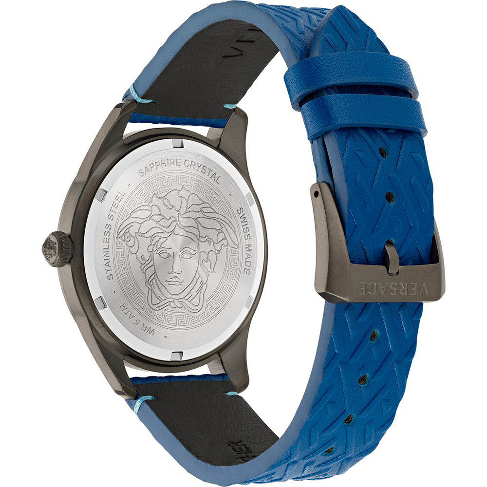 El reloj analógico Versace Greca Time GMT para hombre es el reloj perfecto para lucir o regalar. Su caja redonda Gun de 41 mm combinada con la cómoda correa de cuero azul le permitirá disfrutar de este impresionante reloj sin ningún compromiso. Operado por un movimiento de cuarzo de alta calidad y resistente al agua hasta 5 bares, su reloj seguirá funcionando con precisión. Este reloj de alta calidad es un reloj para hombre increíblemente llamativo.