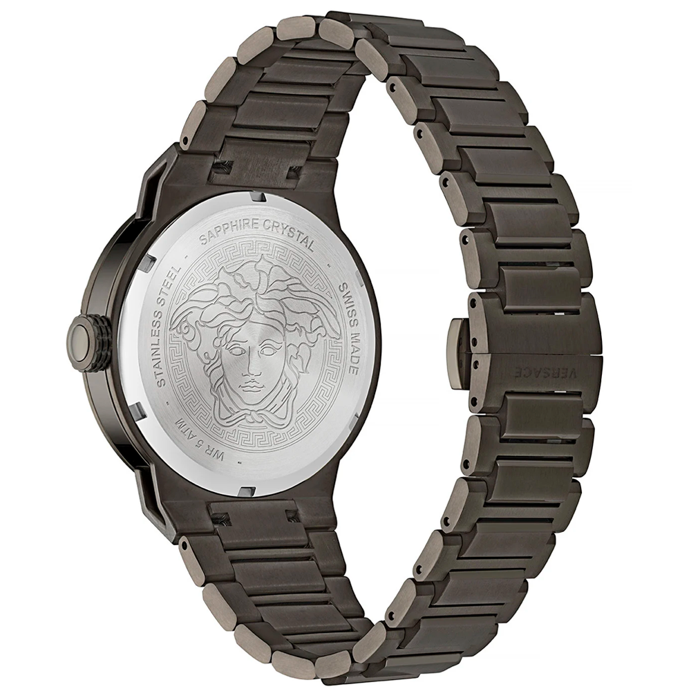El Versace Infinite Gent de 43 mm es un reloj elegante y llamativo que seguro llamará la atención. El motivo de la cabeza de Medusa, que se encuentra en el centro de la esfera, es un icono de la marca Versace. Los detalles de Greca, que se encuentran alrededor de la esfera, agregan un toque de sofisticación.