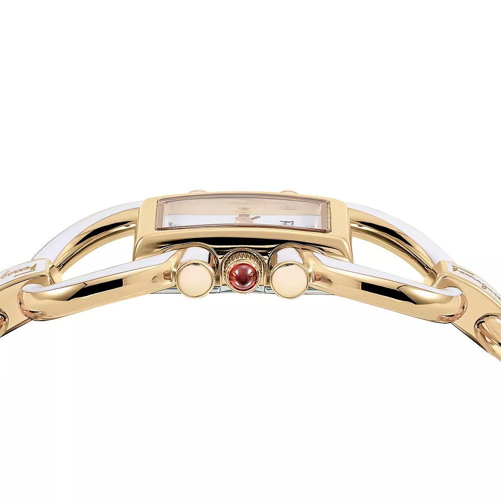 La caja rectangular y la pulsera modular de acero inoxidable con tratamiento de oro IP están adornadas con el icónico Gancino de Ferragamo, que le da al reloj un aspecto único y distintivo.