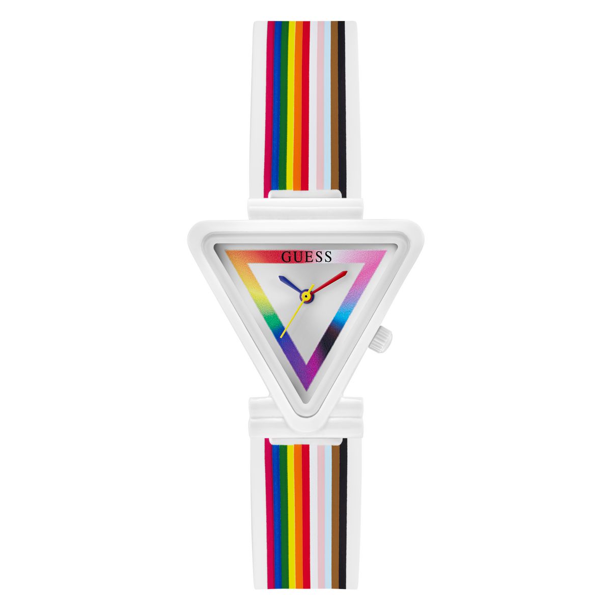 El GUESS GW0679L1 es un reloj de mujer vibrante y expresivo de la colección Fame, diseñado como parte de la serie Pride Limited Edition. Cuenta con una caja triangular de 30 mm hecha de nailon de base biológica, combinada con una correa de silicona blanca impresa con la bandera de inclusión LGBTQ2IA+.
